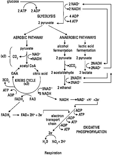 The reactions that convert fuel to usable energy (ATP molecules) include glycolysis, aerobic respiration (the Krebs cycle), anaerobic respiration, and oxidative phosphorylation. Together these reactions are referred to as cellular respiration. These are complex pathways, so expect to take some time to understand them. Refer to Figure 1-2 as many times as necessary to make sure you understand what happens in cellular respiration.
