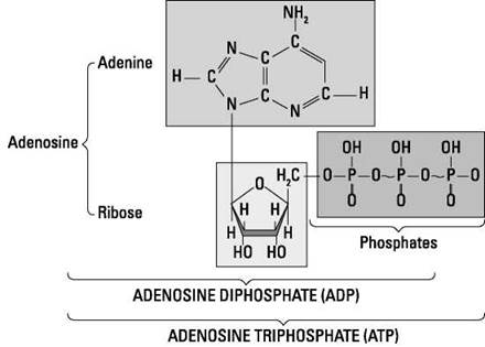 ATP is the cell’s energy currency. Just as you can’t keep spending money without earning some money to replenish your supply, your body can’t keep expending energy without taking in more fuel. When the cell needs energy to fuel its metabolism, it pays with ATP molecules. See Figure 1-3 for the chemical structure of the ATP and related ADP molecules.