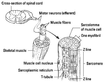 Muscle spindles are specialized skeletal muscle fibers that are wrapped with nerve fibers. Figure 3-3 shows how skeletal muscle is connected to the nervous system. Spindles are distributed throughout the muscle tissue and provide sensory information to the central nervous system.
