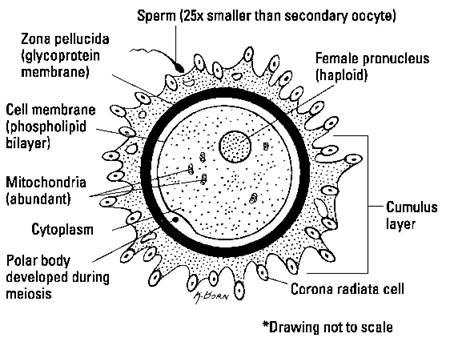 A mature ovum (see Figure 8 - 1) is one of the largest cells in the human body, about 120 micrometers in diameter (about 25 times larger than sperm) and visible without magnification. The ovum contains a haploid nucleus, ample cytoplasm, and all the types of organelles usually found in the somatic cell, all within a plasma membrane. The plasma membrane is enclosed within a glycoprotein membrane called the zona pellucida, which protects the zygote and pre-embryo until implantation.