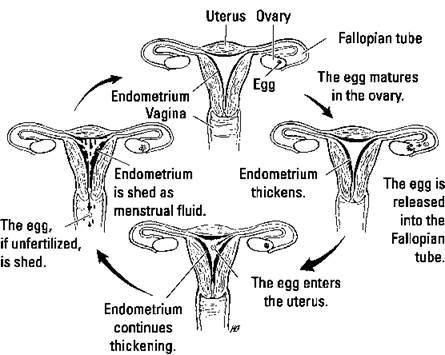 The menstrual cycle (monthly cycle) consists of the ovarian cycle and the uterine cycle, both of which are approximately 28 days in duration (see Figure 8 - 2). These cycles run concurrently to prepare the ovum and the uterus, respectively, for pregnancy.