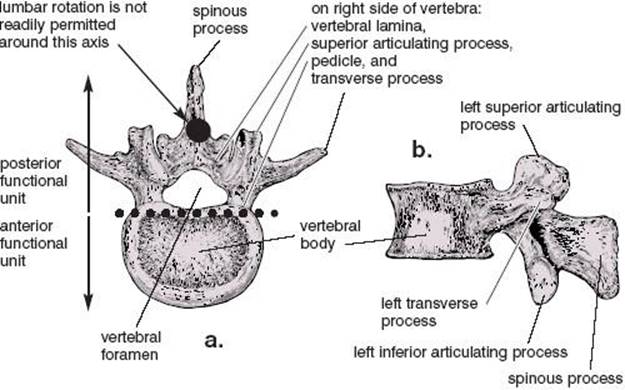 Figure 4.5. Superior view (from above) of fourth lumbar vertebra (a) and a view from its left side (b). The heavy dotted line in “a” indicates at the level of a single vertebra the separation of the anterior functional unit from the posterior functional unit. Notice also in “a” how the parasagittal orientation of the superior and inferior articulating processes, along with an axis of rotation that is located near the base of the spinous process (large dot), will be expected to inhibit lumbar twisting (from Morris).