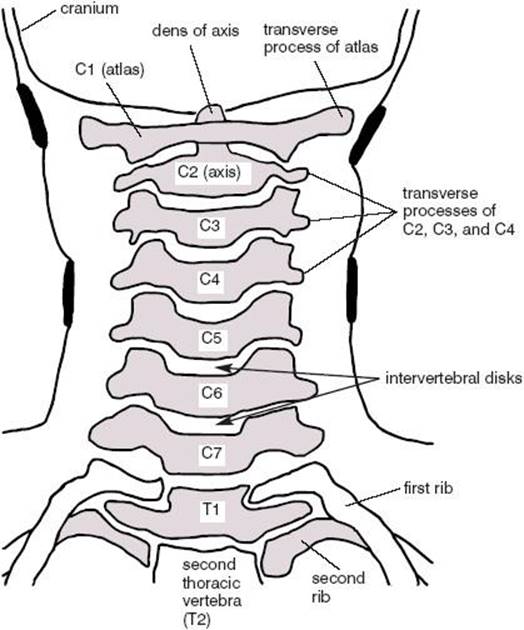 The top two cervical vertebrae are specialized for articulation with the skull. C1 sits just underneath the skull, and C2 provides the axis around which C1 plus the skull rotate when the head is turned. We’ll take a closer look at those two vertebrae and their articulations in chapter 7.