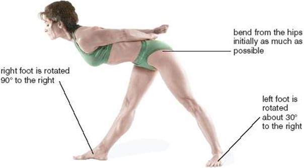 The rear foot brings attention to the roles of the lateral rotators, but the front foot, the one you are facing, brings awareness to the medial rotators of the thigh (the gluteus medius and minimus) in addition to the obvious stretch in the hamstrings. The medial rotators are in a neutral position and are only moderately stretched any time the foot is pointed straight ahead, as is usual for this posture, and they will be relieved even of that tension if the foot is rotated medially 10–15°. For something really different, try rotating the front foot laterally, and you’ll quickly sense the role of these muscles as medial rotators, because they instantly tighten up and limit the bend. These experiments reveal that analyzing the angle posture only with respect to the hamstrings of the front thigh is fine for an introduction to the posture, but just the beginning for anyone who is interested in serious study.