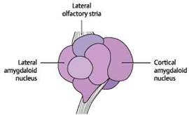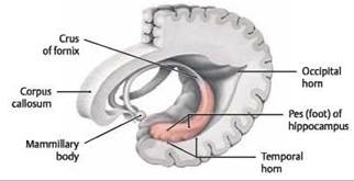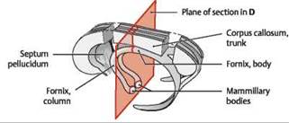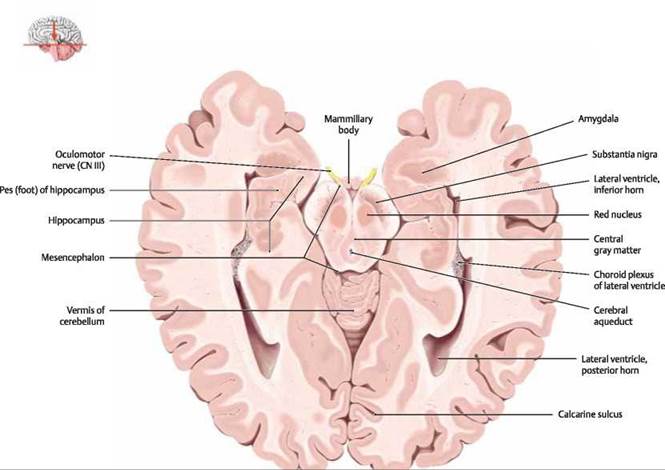 The structures that occupy the largest area at this level are the telencephalon, the medial portions of the mesencephalon, and the cerebellum. The nuclei located on the median aspect of each frontal lobe of the telencephalon are the amygdalae. The lower part of the section cuts the calcarine sulcus with the surrounding visual cortex. This section also passes through the choroid plexus of the lateral ventricles, whose posterior and inferior horns are displayed. Important structures of the mesencephalon are the substantia nigra and red nucleus, both of which are part of the motor system. The mammillary bodies are part of the diencephalon and are connected by the fornix (not visible in this section) to the hippocampus, which is part of the telencephalon. The mammillary bodies lie in the same horizontal plane as the hyppocampus and the same coronal plane as its pes (foot). These relationships result from the curved shape of the fornix (see D). More transverse sections at lower levels would supply little additional information on the cerebrum, and so our series of transverse sections ends here. The brainstem structures lying below the mesencephalon are displayed in a separate group of sections (see p. 234, 235).