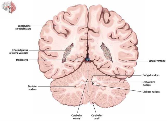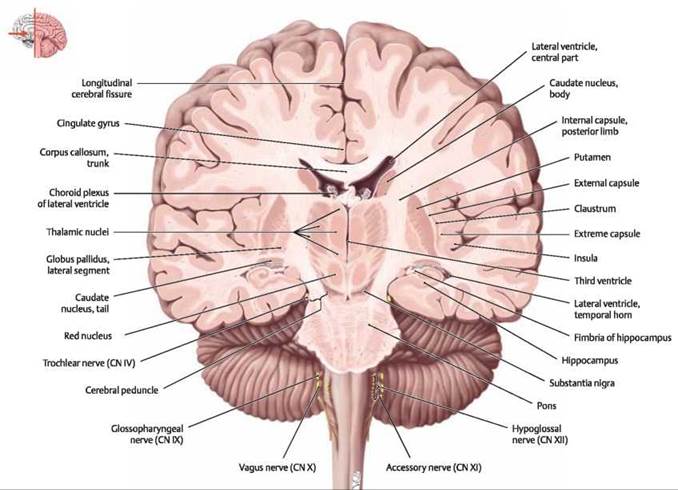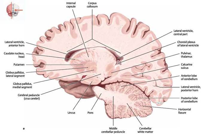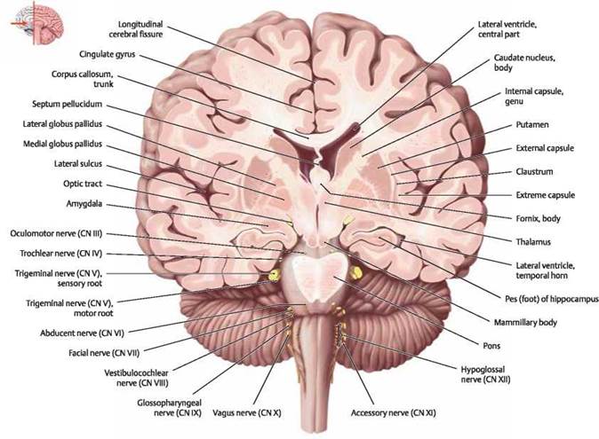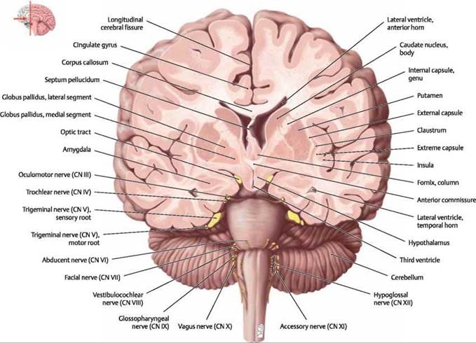 The series of sections (coronal, transverse, and sagittal) in this chapter is intended to help the reader gain an appreciation of the three-dimensional anatomy of the brain. This is necessary for the correct interpretation of modern sectional imaging modalities (CT and MRI for the investigation of suspected stroke, brain tumors, meningitis, and trauma). In offering this synoptic perspective, we assume that the reader has read the previous chapters and has gained at least a general appreciation of the functional and descriptive anatomy of the brain. The legends and especiallythe small accompanying schematic diagrams are intended to facilitate a three-dimensional understanding of the two-dimensional sections (the plane of the section in each figure is indicated by a red line in the small, inset image).