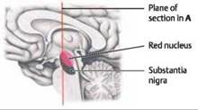 • Red nucleus • Substantia nigra • Cerebral peduncle (crus cerebri) |