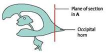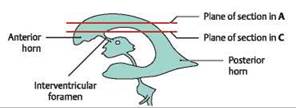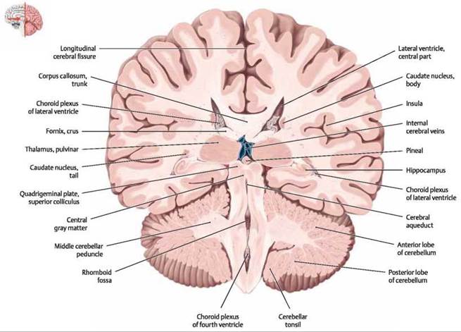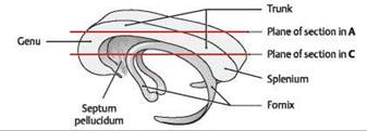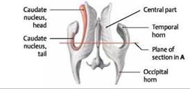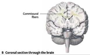 This highest of the transverse brain sections passes through frontal, parietal, and occipital structures of the telencephalon. Each of the two/at- его/ ventricles is bordered laterally by the body of the caudate nucleus, and medially by the trunk of the corpus callosum. The corpus callosum transmits fiber tracts which interconnect areas in both hemispheres that serve the same function (commissural tracts). When viewed in cross section, the corpus callosum appears to be interrupted by the ventricles and caudate nucleus, when, in fact, it arches over these structures, forming the roof of the lateral ventricles. The course of the tracts that pass through the corpus callosum can be appreciated by looking at a coronal section (see B).