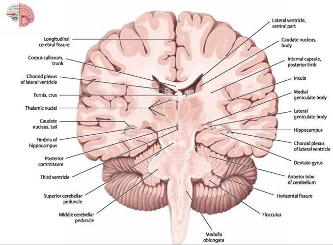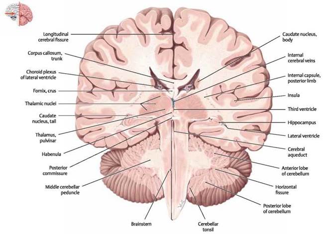 The caudal thalamic nuclei are well displayed in this section, bordering the lateral ventricles from below and the third ventricle from the sides. The putamen lies at a more oral level and is no longer visible in this plane (see the transverse section on p. 306). This section passes through the posterior limb of the internal capsule (see also C, p. 294) and the anterior part of the posterior commissure (see D, p. 299). The medial and lateral geniculate bodies, which are components of the auditory and visual pathways, appear as two darker nuclei that flank the thalamus on the right and left sides at the same level as the commissure (see F). The crura of the fornix can be seen between the thalamus and corpus callosum. This is the first section that passes through part of the cerebellum. Here the middle cerebellar peduncle passes laterally toward the cerebellar hemispheres.