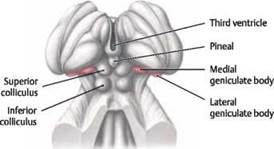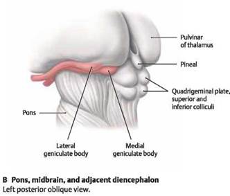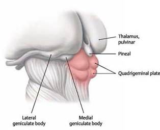 Note: closely adjacent structures in the brain may belong to different ontogenetic regions. For example, the medial and lateral geniculate bodies are part of the diencephalon, while the superior and inferior colliculi (the latter is not visible), which make up the quadrigeminal plate, are part of the mesencephalon. It should be recalled, however, that the lateral geniculate body and superior colliculus are part of the visual pathway while the medial geniculate body and inferior colliculus are part of the auditory pathway.