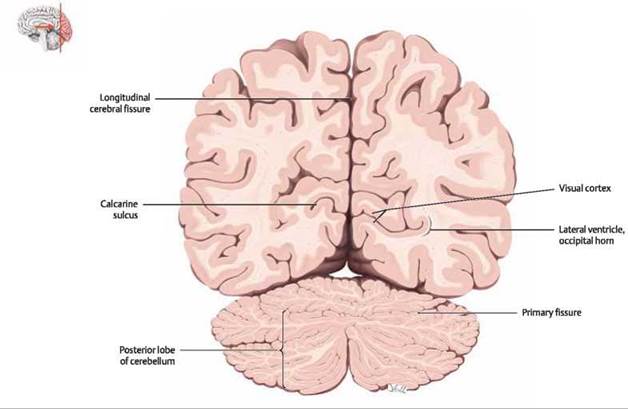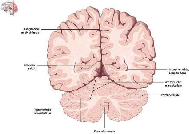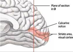 In the plane of this section, the posterior (occipital) horn of the lateral ventricle has dwindled to a narrow slit. The relatively long calcarine sulcus is visible in the occipital lobe of the cerebrum, and also appears in several of the proceeding sections. It is surrounded by the striate area (primary visual cortex, also called area 17 in the Brodmann brain map, p.202), the size of which is best appreciated on the medial surface of the brain (see E). More occipital sections are not presented in this chapter, as they would show nothing but cortex and white matter.