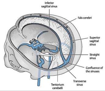 The plane of this section clearly shows the posterior (occipital) horns of the lateral ventricles; these appear only as narrow slits in the next section (see D). The section also illustrates once again how the posterior horn is a prolongation of the inferior (temporal) horn (see B). Between the cerebellum and the occipital lobe of the cerebrum lies the tentorium cerebelli (see C). The tentorium contains the straight sinus, which passes to the confluence of the sinuses. It is one of the dural venous sinuses that drain blood from the brain, beginning at the confluence of the great cerebral vein and the inferior sagittal sinus (removed during preparation of the falx cerebri). Because the dura is removed from the brain in the preparation of most tissue sections, the sinuses enclosed by the dura mater also tend to be removed.
