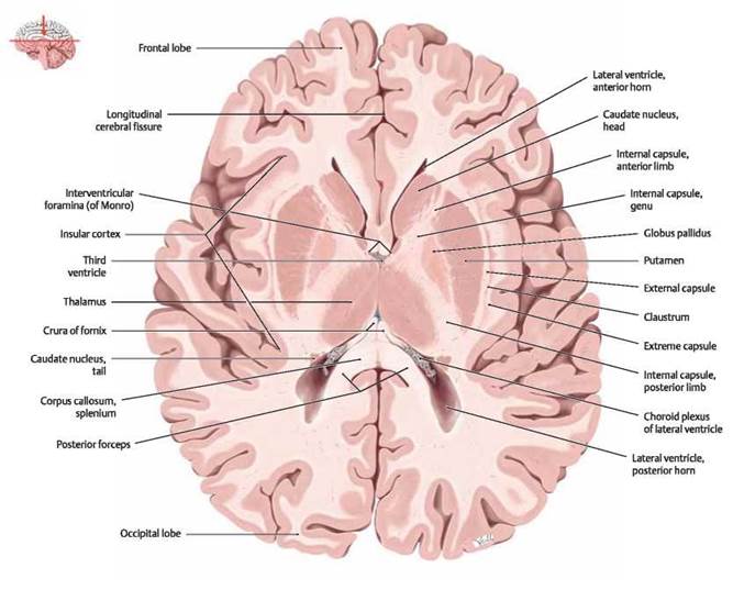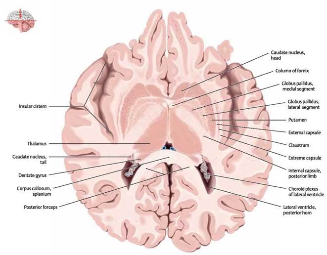 The lateral ventricles communicate with the third ventricle through the interventricular foramina (of Monro). They are located directly anterior to the thalamus (see D, p.305, and A, p. 296). The nuclei of the telencephalon make up the deep gray matter of the cerebrum. The spatial relationship between the caudate nucleus and thalamus is illustrated in B. The caudate nucleus is larger frontally, and the thalamus larger occipitally. While the caudate nucleus and putamen of the motor system belong to the telencephalon, the thalamus of the sensory system belongs to the diencephalon. This transverse section passes through the caudate nucleus twice due to the anatomical curvature of the nucleus. This is the first transverse section that displays the globus pallidus, part of the motor system. The insular cortex is seen with the claustrum medial to it. The crura of the fornix are seen as posterior to the thalamus (see also E, p. 305). They unite at a slightly higher level to form the body of the fornix, which lies just below the corpus callosum and was visible in the previous section (see C, p. 305). The course of the internal capsule is visible in both this section and the last.