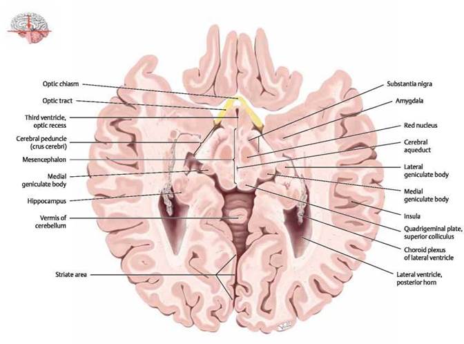 Structures visible in this section include the cerebral aqueduct, the basal part of the third ventricle (see also B, p.294), and the optic recess. While the third ventricle is slitlike at this level, the section cuts a very large area of the ventricular system where it opens into the two posterior horns. This is the first transverse section that displays the midbrain (mesencephalon), passing through its oral portion (note: terms of location and direction refer to the brainstem axis, see p. 198). The cerebral peduncles (crura cerebri), the substantia nigra, and the superior colliculi of the quadrigeminal plate can also be seen. Visible structures of the diencephalon in this plane include the medial and lateral geniculate bodies (appearing only on the right side, see B) and the optic tract, which is an extension of the diencephalon.
