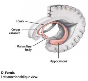 The division of the globus pallidus into medial and lateral segments can now be seen clearly. This section displays the full width of both the inferior horn of the lateral ventricle and the claustrum (believed to be important in the regulation of sexual behavior). While the plane in A passed through the anterior commissure, this more occipital plane slices the mammillary bodies (see E). Pathological changes in the mammillary bodies can be found during autopsy of chronic alcoholics. The mammillary bodies are flanked on each side by the foot of the hippocampus. An important part of the limbic system, the mammillary bodies are connected to the hippocampus by the fornix (see F). Due to the anatomical curvature of the fornix, its column is visible in more frontal sections (see A), while its crura appear as widely separated structures in more occipital sections (see C, p. 299). The septum pellucidum stretches between the fornix and corpus callosum, forming the medial boundary of the lateral ventricles (see A and D).