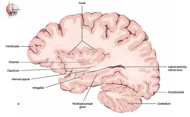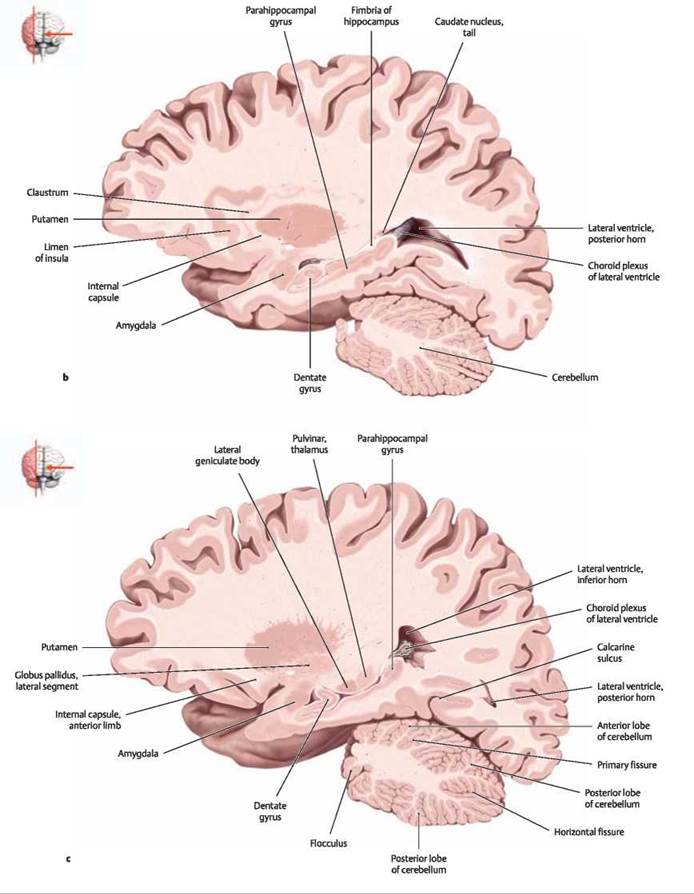 Left lateral view. The plane of section a passes through the inferior (temporal) horn of the lateral ventricle; the more medially situated posterior (occipital) horn is seen in b and c (see C, p. 296 for relative position of both horns). The amygdala, which is directly anterior to the inferior horn, lies in the same sagittal plane as the parahippocampal gyrus (a-c; see also C, p. 309). The internal capsule can also be seen in sections a-c; the long ascending and descending tracts pass through this structure. The most lateral section (a) offers the only view of the insular cortex, a part of the cerebral cortex that has sunk below the surface of the hemisphere (compare with the coronal sections on p. 293 and the following pages). The putamen, the most laterally situated among the basal ganglia of the telencephalon (see also A, p. 296) is also found in a, but appears larger in the more medial sections (b, c). A portion of the claustrum can be seen ventral to the putamen (a), although most of the claustrum is lateral to the putamen (see A, p.297) and outside the plane of the section. Section bjust cuts the tail of the caudate nucleus, which is situated more laterally than its head and body (see also D, p. 279). The most medial section in this series (c) cuts the calcarine sulcus (see p. 312) and the lateral geniculate body which lies at the edge of the thalamus. The lateral segment of the globus pallidus can also be seen (c): the segments of the globus pallidus are actually medial to the putamen (see D, p.295), but can be visualized here due to their concentric arrangement.
