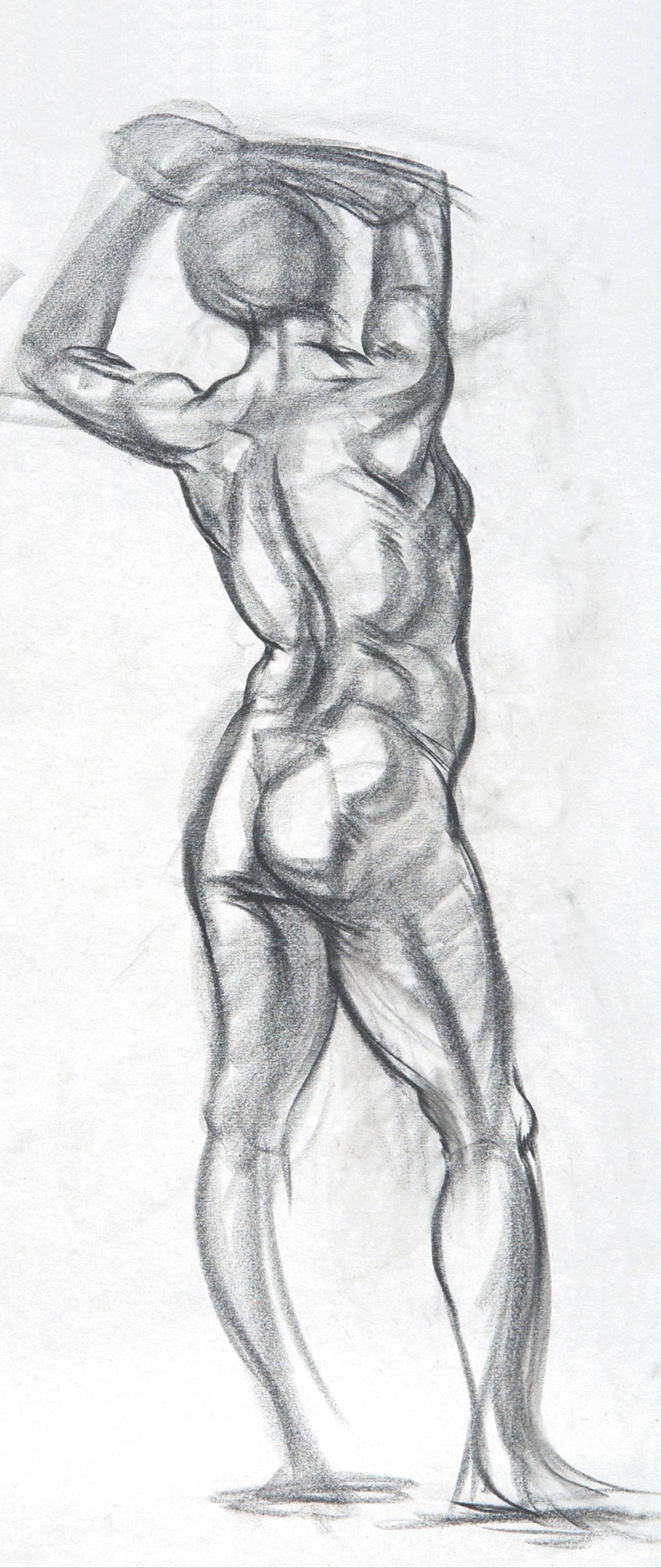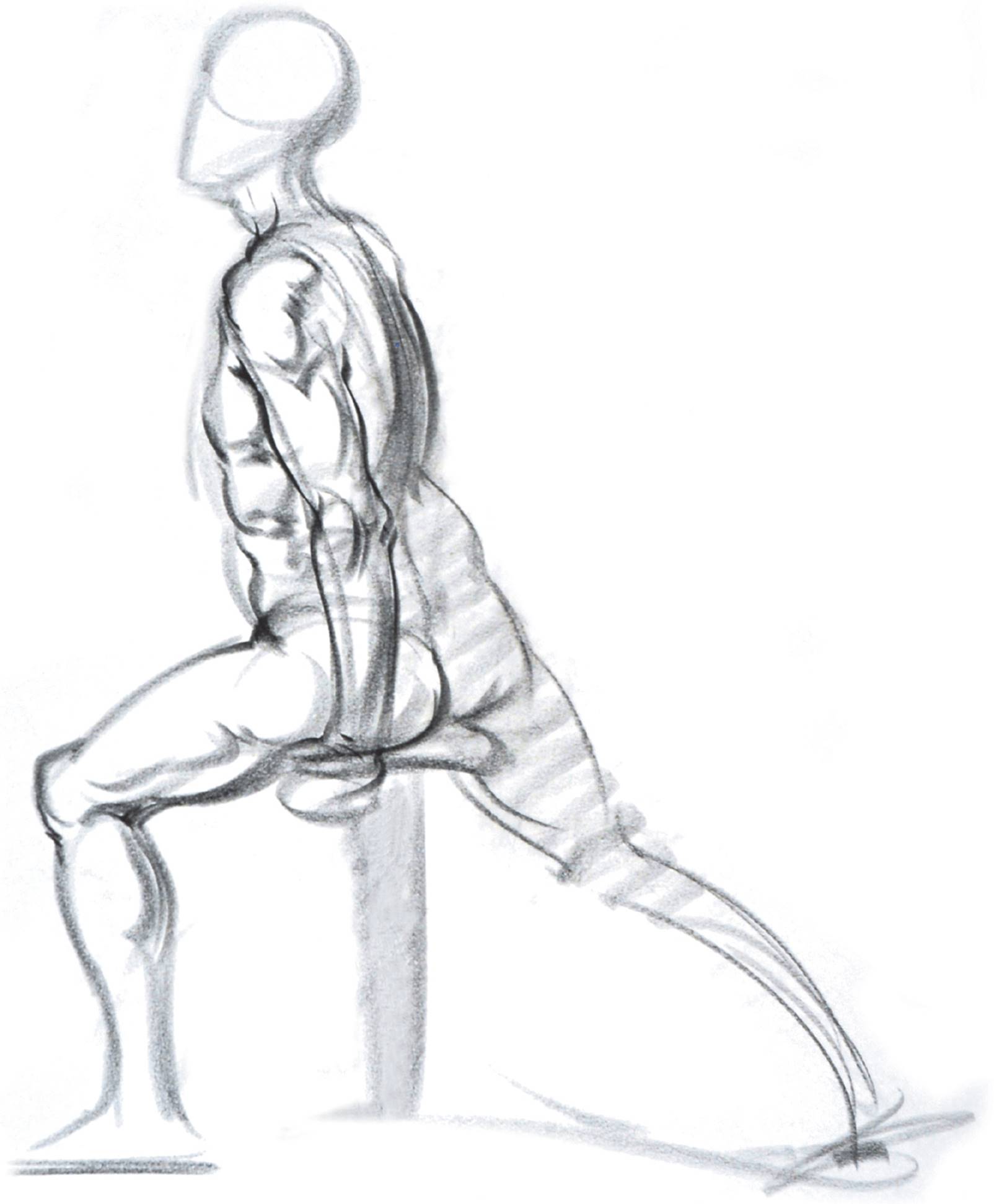 Because the poses for this approach are somewhat longer, you’ll have time to indicate a few anatomical forms, including musculature, within the study. But you have to work briskly, since the poses are still rather brief. Select the anatomical forms you want to emphasize, and keep them simple.