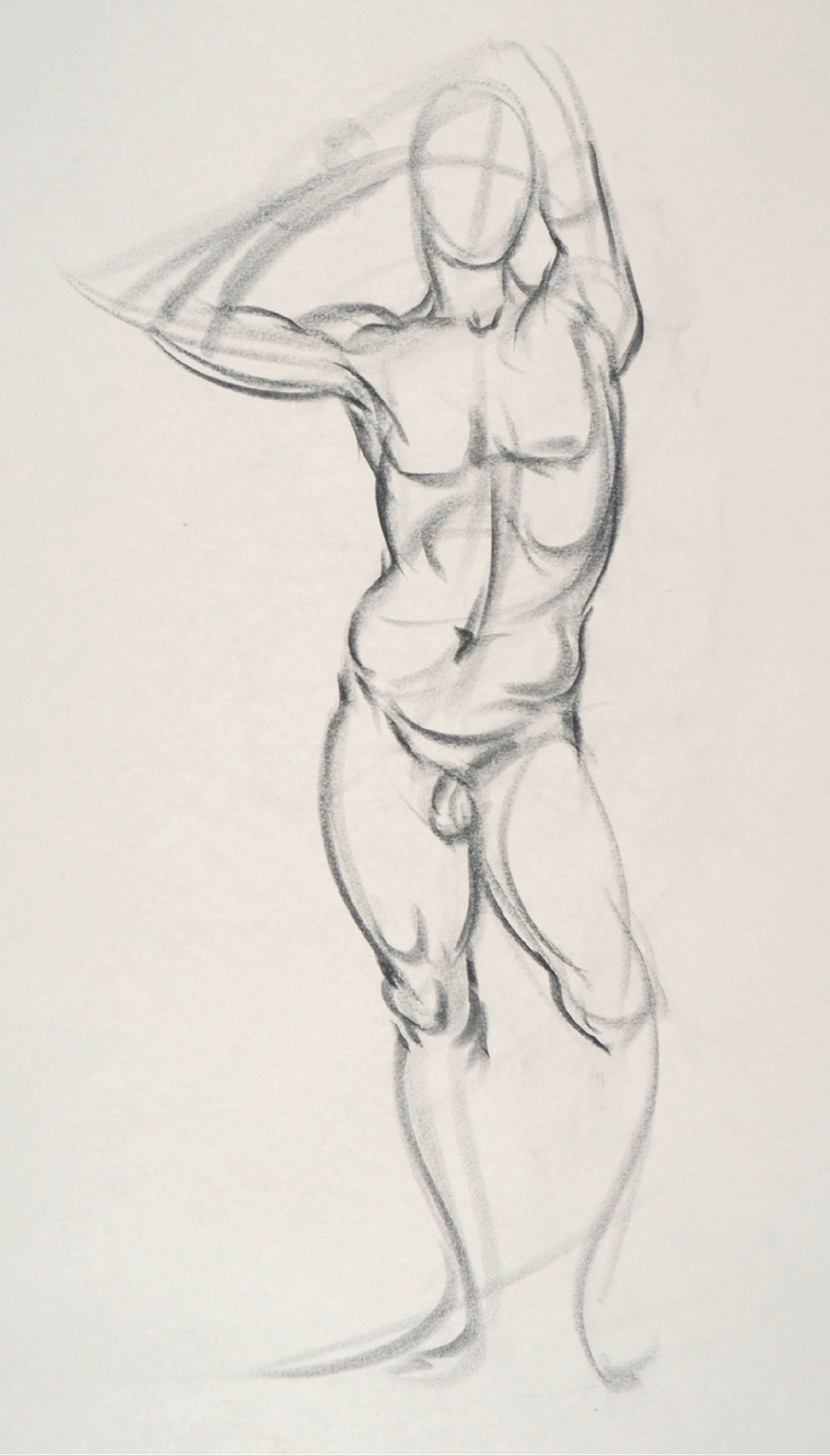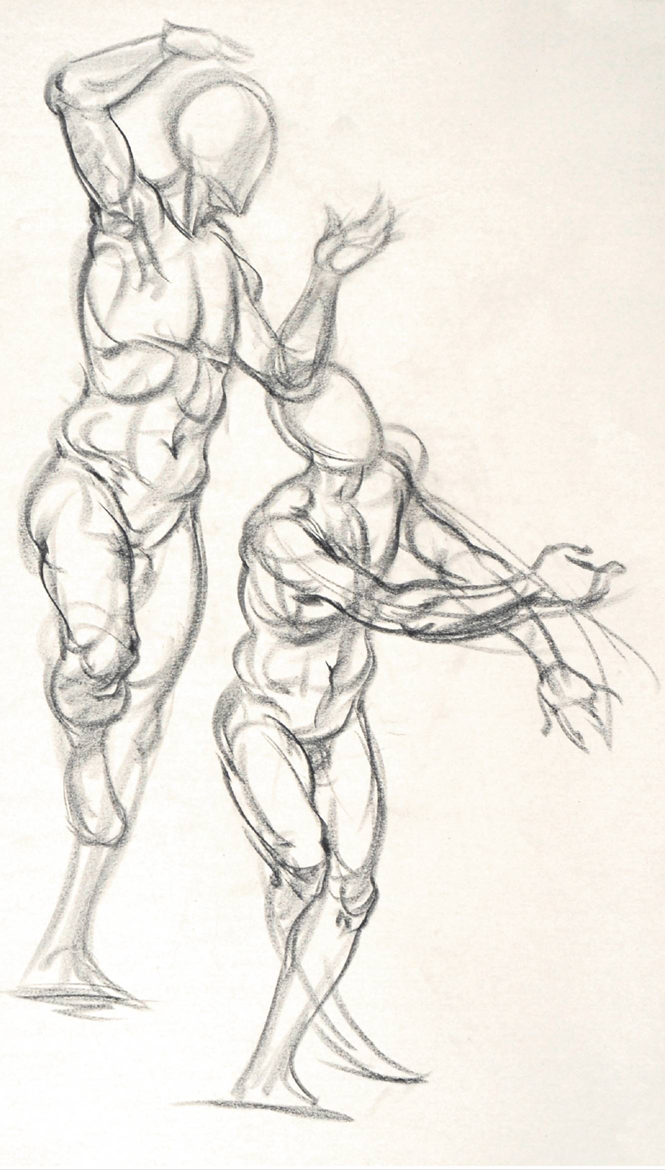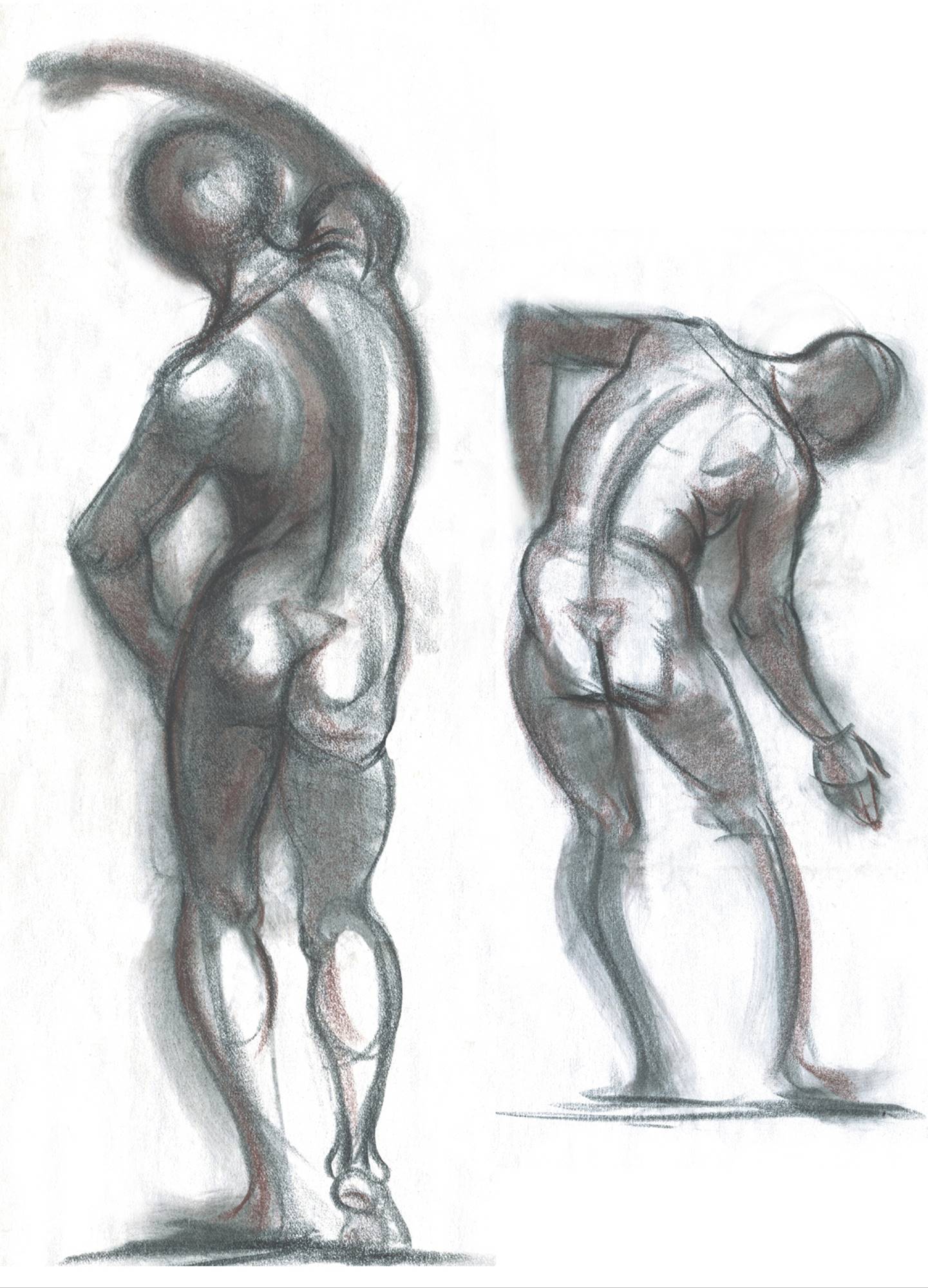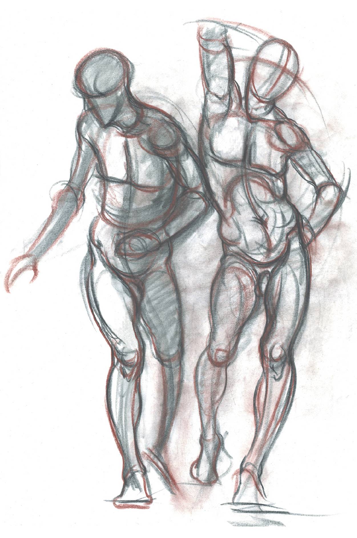 You might want to purposely emphasize the manikin shape within the final drawing as a way of indicating the basic structure of a particular pose. To do this, you might draw the manikin in a color (a sanguine, say) while using black for the anatomical forms.