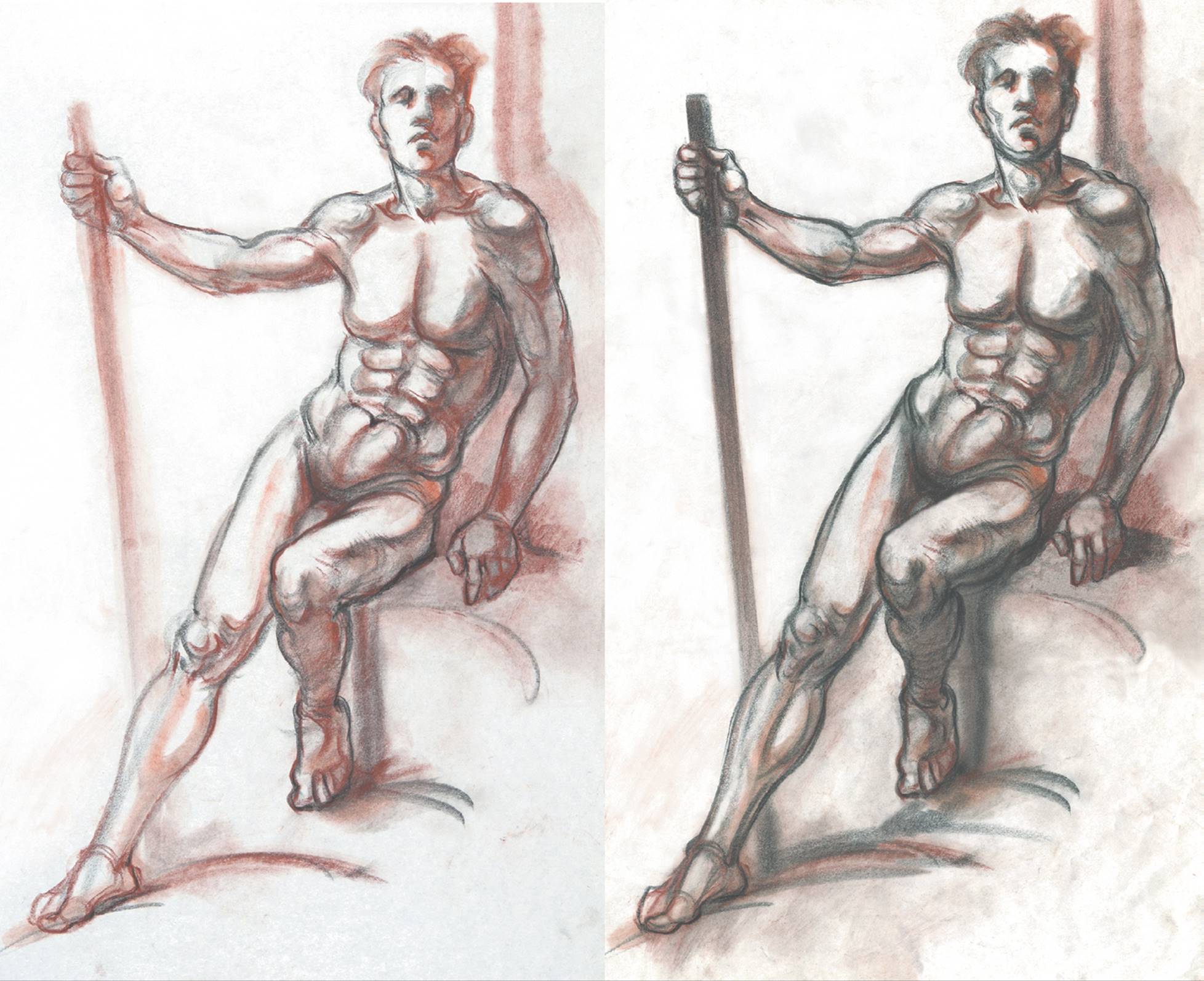 The original gesture drawing, at left, was a 5-minute study done in sanguine and black Conté crayon on newsprint. In the enhanced drawing at right, I used additional black Conté crayon for the added tones and lines.