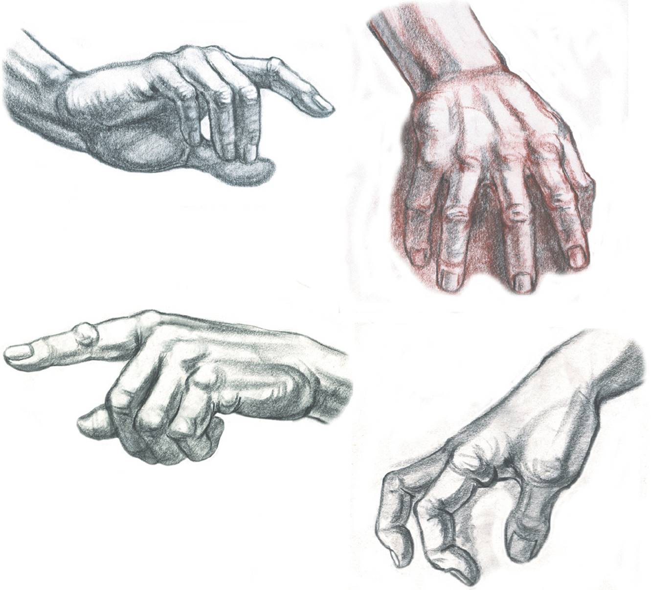 Black Conté crayon on white paper (with added sanguine Conté crayon on the study with spread fingers).