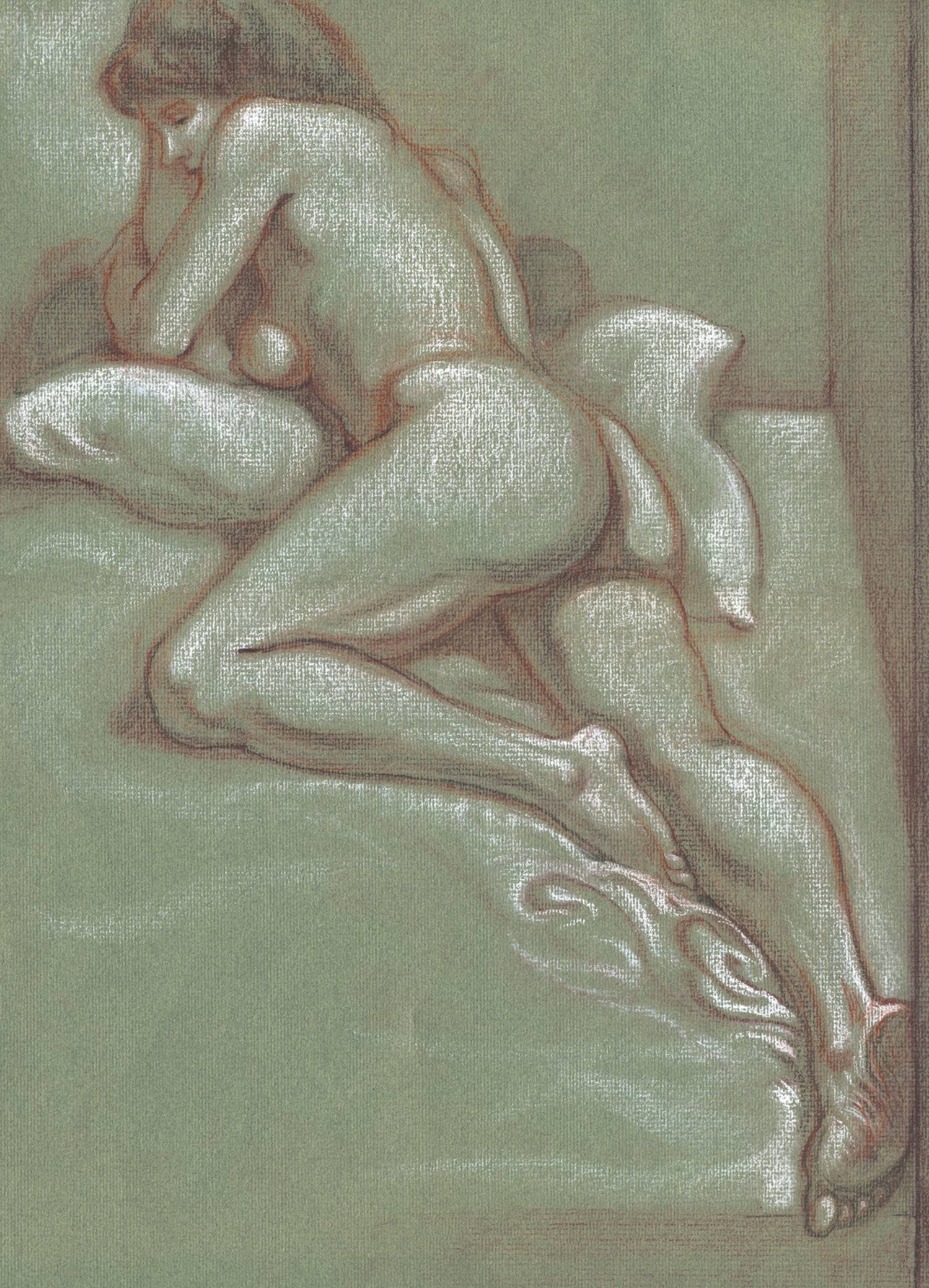 This approach is similar to the organic line approach, but it allows you to use additional tones. The lines can be applied with a graphite pencil, charcoal, or colored pencils that are kept sharpened (see sidebar). As with the organic line approach, your lines can vary in width, giving a calligraphic quality to certain parts of the drawing. Your contour lines can capture the figure’s anatomical forms—but, again, in a very selective, edited way. You can apply tones with the same tool you use for the line work, or you can dip a chamois cloth in charcoal or pastel dust and lightly smear the tones on the drawing.