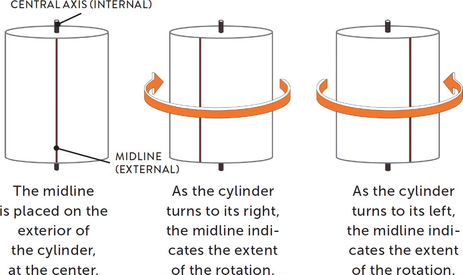 Twisting is a spiraling action involving more than one form. Generally speaking, a twisting movement can only occur if one structure (such as the rib cage) turns in one direction while another structure (such as the pelvis) is turning in a different direction. This creates a torque between the two structures and usually twists the soft tissues connecting them. At the left in the bottom drawing opposite are two stacked cylinders facing forward in the normal, upright position, with their central axis placed in the internal center and the midline placed along the center of the exterior. In the middle, the upper cylinder is turning toward its right while the lower cylinder turns toward its left. On the right, the twisting movement is reversed.