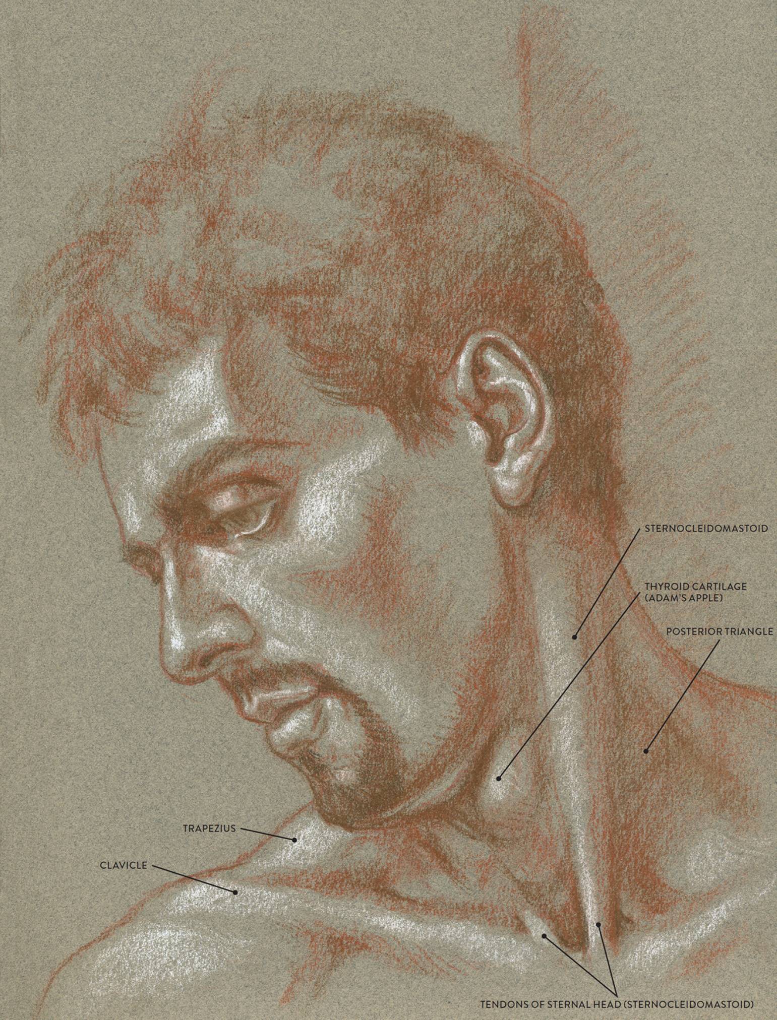 How much you want to learn about muscle attachments is up to you, but this knowledge can be advantageous for an artist. Medical illustrators and forensic artists of course need to know the locations of attachments for superficial- and deep-layer muscles, but any artist whose intention is to create realistic (as oppose to stylized) figures, who draws from memory, or who works with figural movement will also find this information beneficial, because without this awareness, the muscular forms might appear inaccurate or possibly distorted. When certain tendons become prominent, then a fairly accurate depiction of how these tendons connect to bone is essential for the overall dynamics of that particular region of the body. An example is the tendon of insertion of the sternocleidomastoid (sternal portion) as it inserts into the upper part of the sternum; this tendon projects quite strongly when the head is rotated. If the tendon is erroneously placed in the wrong location, it might cause that part of the figure to look peculiar.