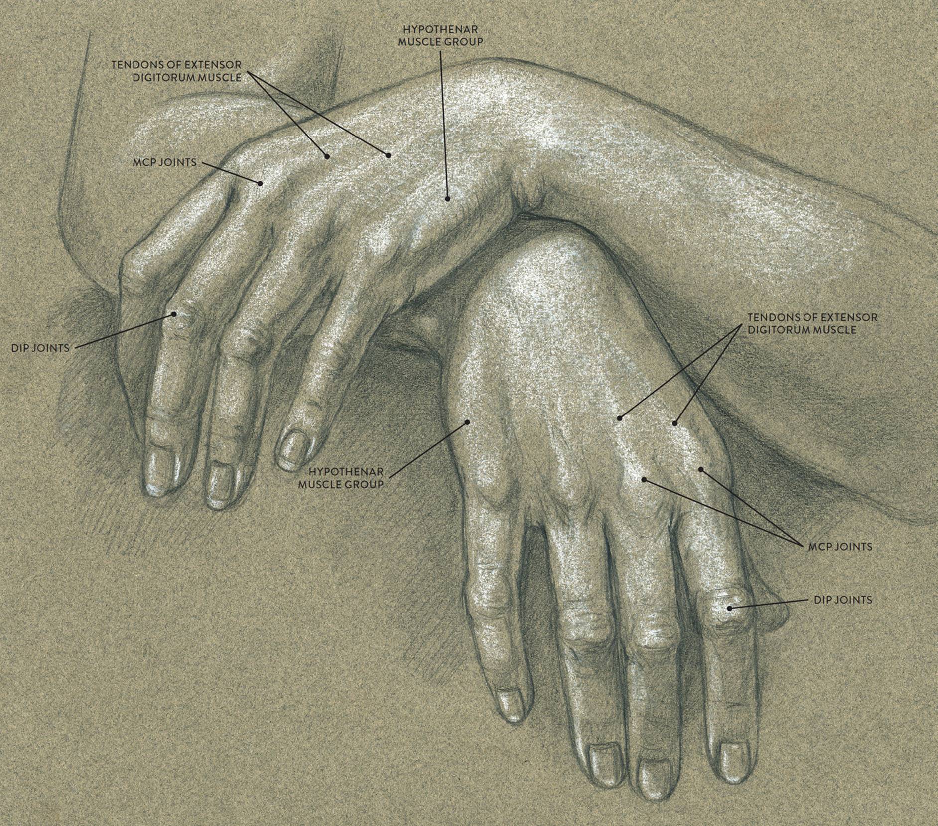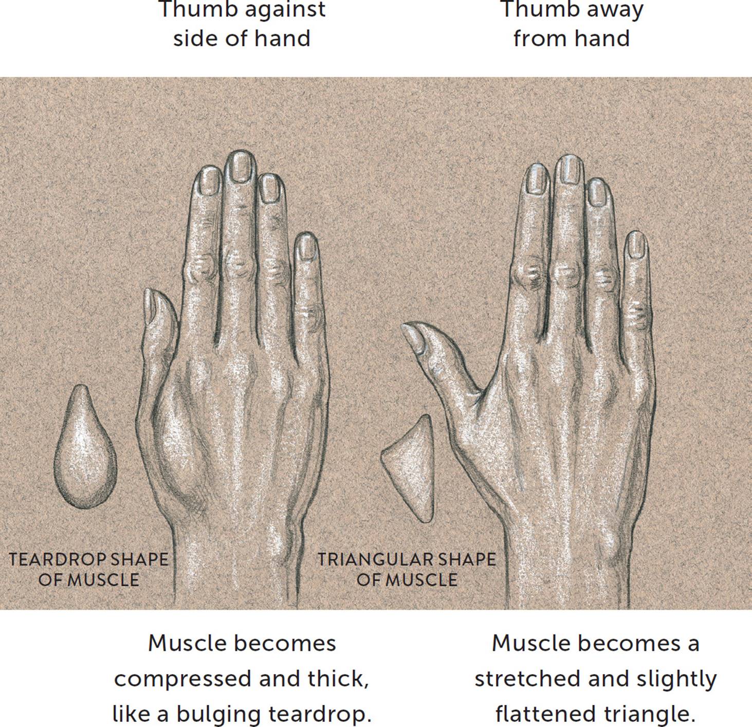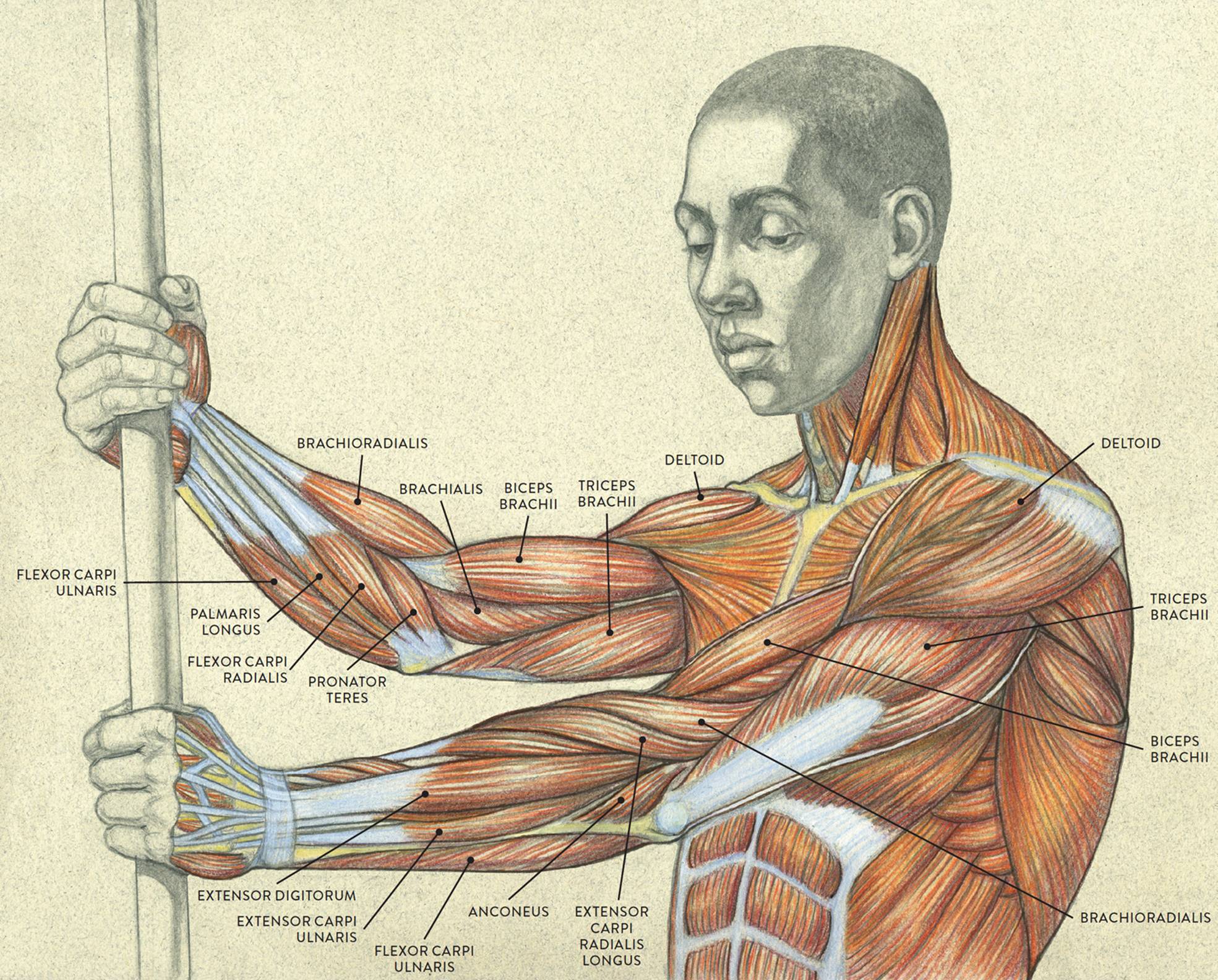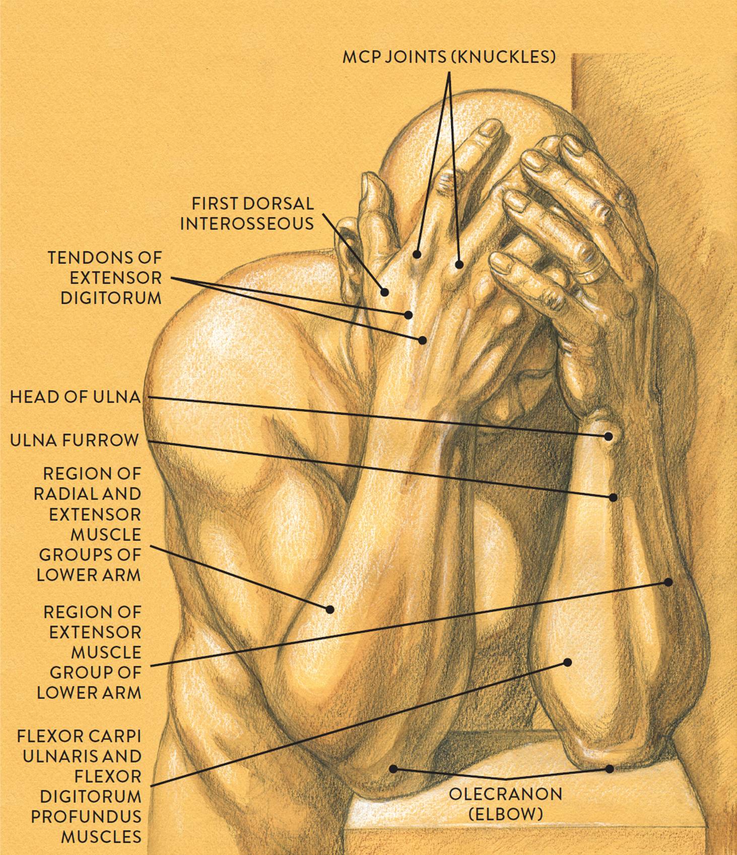 Some figures’ arms are fairly easy to depict, but others’ arms are more challenging. “Average” arms, which are basically cylindrical, streamlined structures, are relatively simple. In these arms, most muscles are inconspicuous because they are covered by a subcutaneous layer of fatty tissue, softening the surface form. A few muscles—the deltoid, biceps, triceps, and brachioradialis—may, however, exhibit interesting shapes even on nonmuscular arms, altering shape in various arm movements.