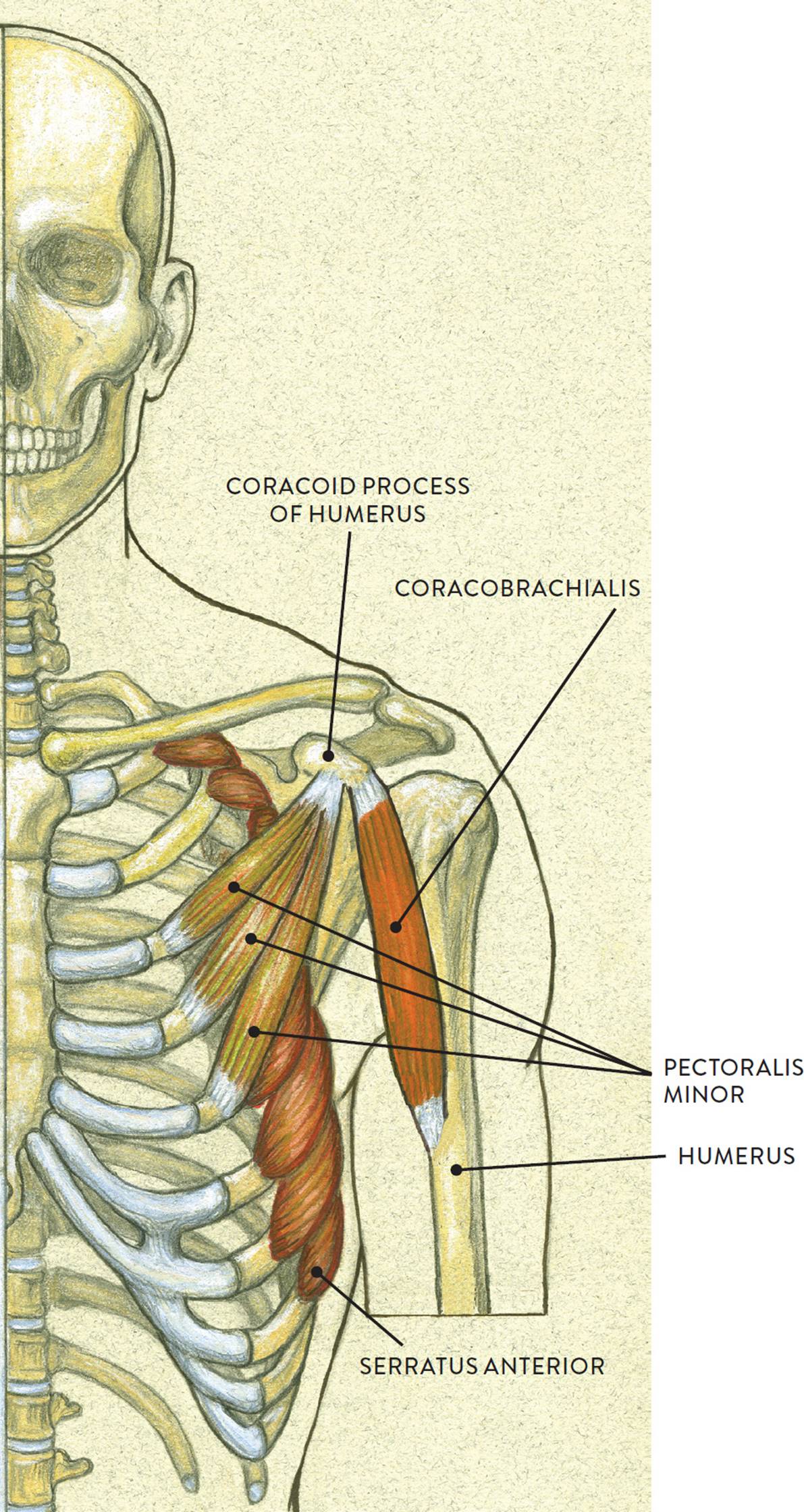 The coracobrachialis (pron., KOR-ah-ko-BRAY-kee-al-iss) is a small elongated fusiform muscle positioned beneath the biceps brachii of the upper arm. The muscle can only be seen on the surface when the upper arm is raised overhead, appearing as small ridgelike form next to the short head of the biceps brachii in the armpit region. The muscle begins on the coracoid process, a small bony projection, shaped like a bird’s beak, on the scapula. It then inserts into the medial side of the humerus. The coracobrachialis helps bend the humerus (flexion), rotates the humerus in an inward direction (medial rotation), and brings the abducted humerus back to its normal location (adduction).