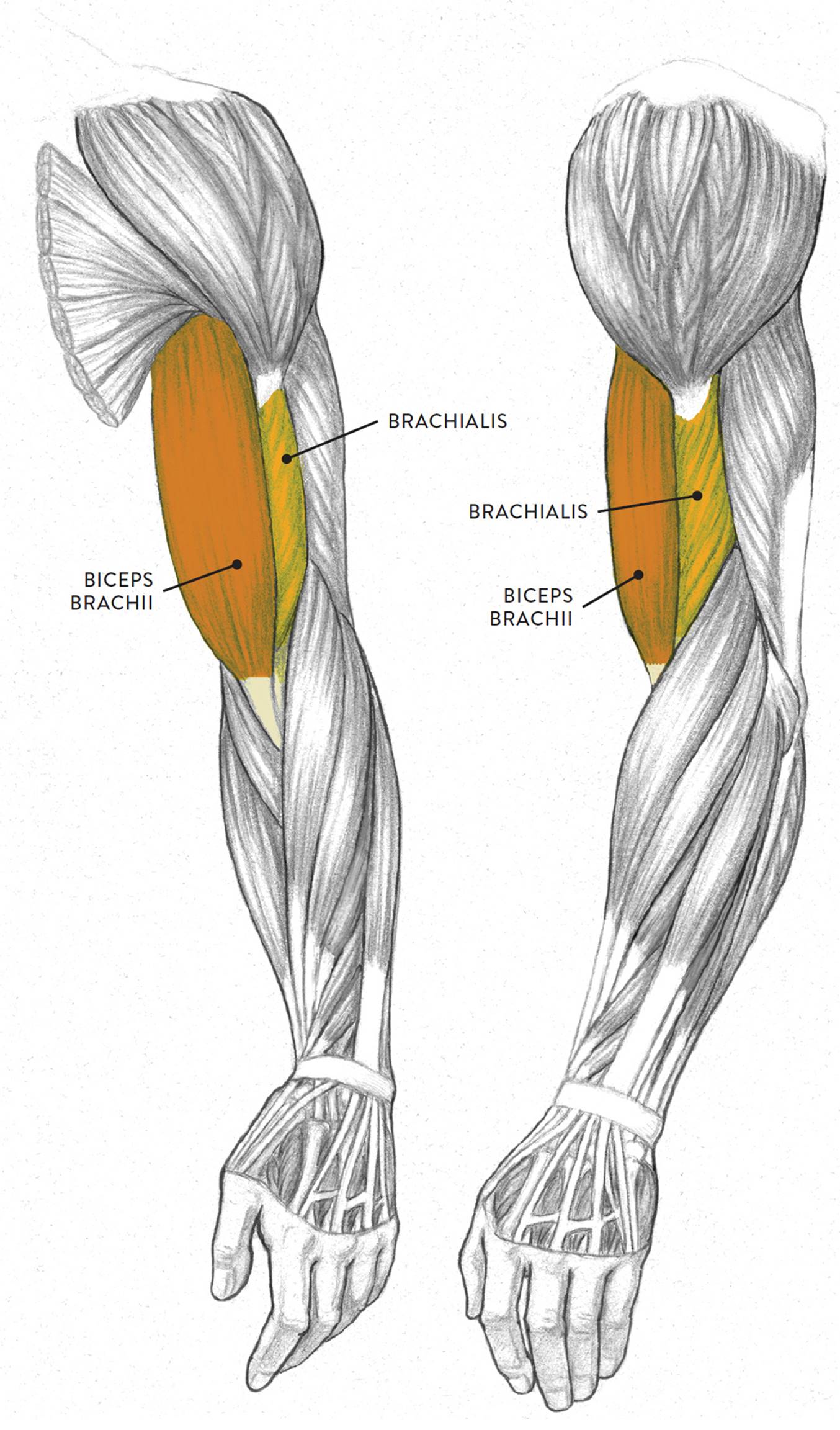 The brachialis (pron., BRAY-kee-al-iss or bray-kee-AA-liss) is a slightly flattened fusiform muscle mostly covered by the biceps brachii. On an average arm the brachialis is hard to detect, but on a muscularly defined arm the muscle can been seen as a slight bulge between the triceps and the biceps. The brachialis begins on the lower half of the humerus and inserts into the coronoid process of the ulna. The muscle assists the biceps brachii in bending the forearm toward the upper arm from the elbow joint (flexion).