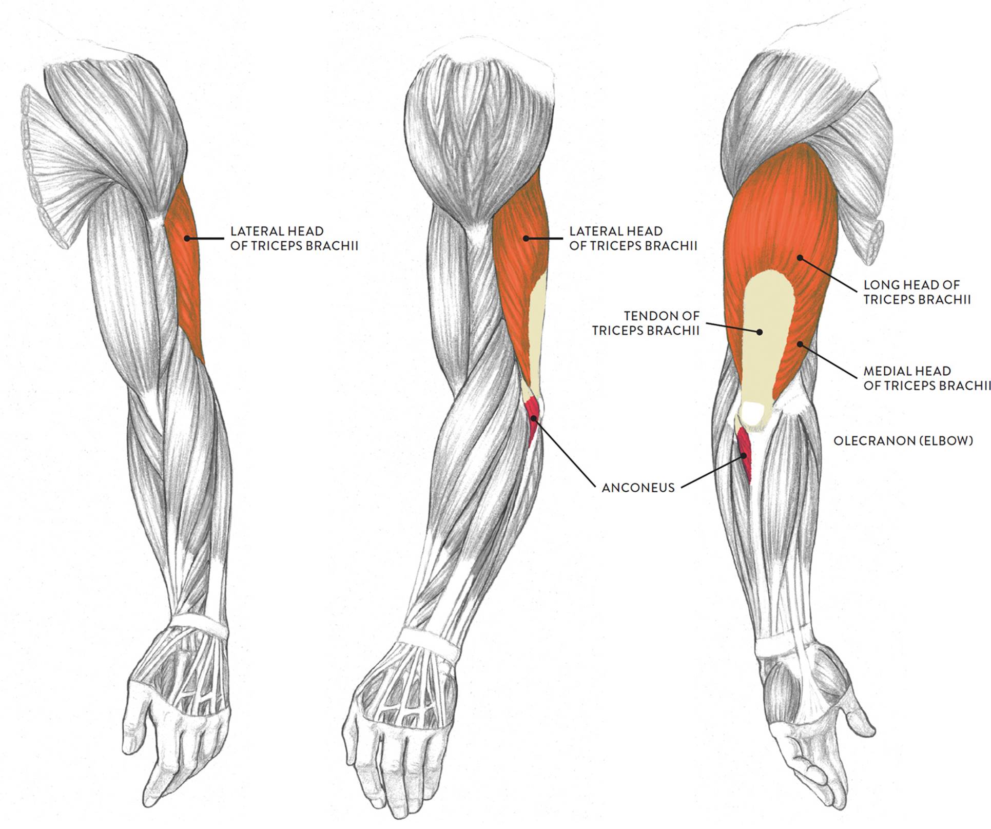 The triceps brachii (pron., TRI-seps BRAY-kee-ee or TRI-seps BRAKE-ee-eye) is a large three-headed muscle occupying most of the posterior aspect of the upper arm. The three heads are the lateral (outer) head, the long head,and the medial (inner) head. If the triceps of the upper arm is significantly developed, a fleshy horseshoe shape will appear on the surface when the muscle contracts—the combined shapes of the heads surrounding the neutral tendon. If the muscle is not well developed, then the back of the relaxed upper arm registers as a cylindrical shape, with very little indication of the triceps heads. On an “average” upper arm, the outer head and long head will appear as two bulges on the surface form only when the muscle is contracting.