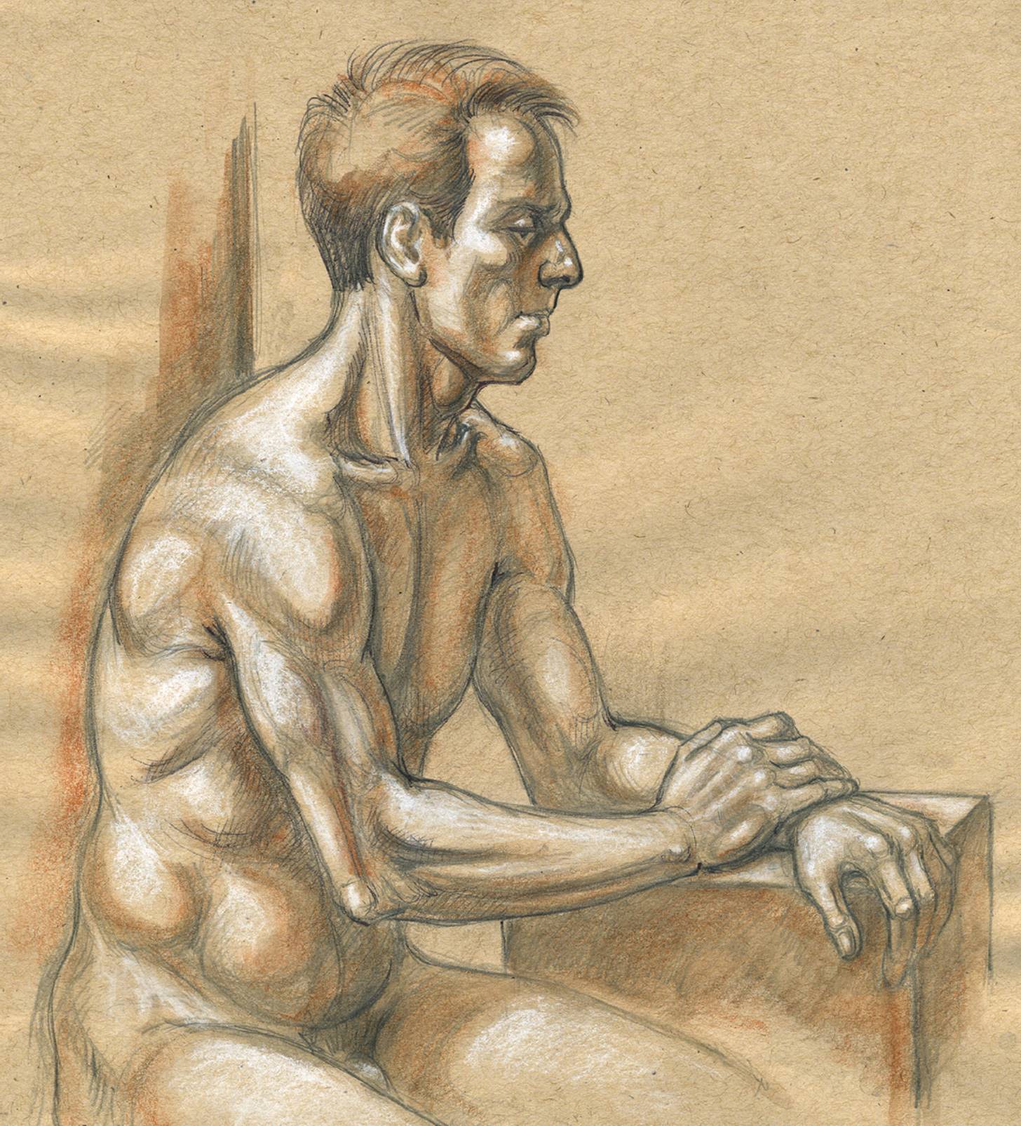 The next life study, Seated Male Figure with Robust, Muscular Legs, focuses on the muscular forms of the anterior region of the upper legs. In it, you can see the quadriceps group, the adductor group, and the sartorious muscle between them. The accompanying muscle diagram further reveals the positions of the muscles in this pose.