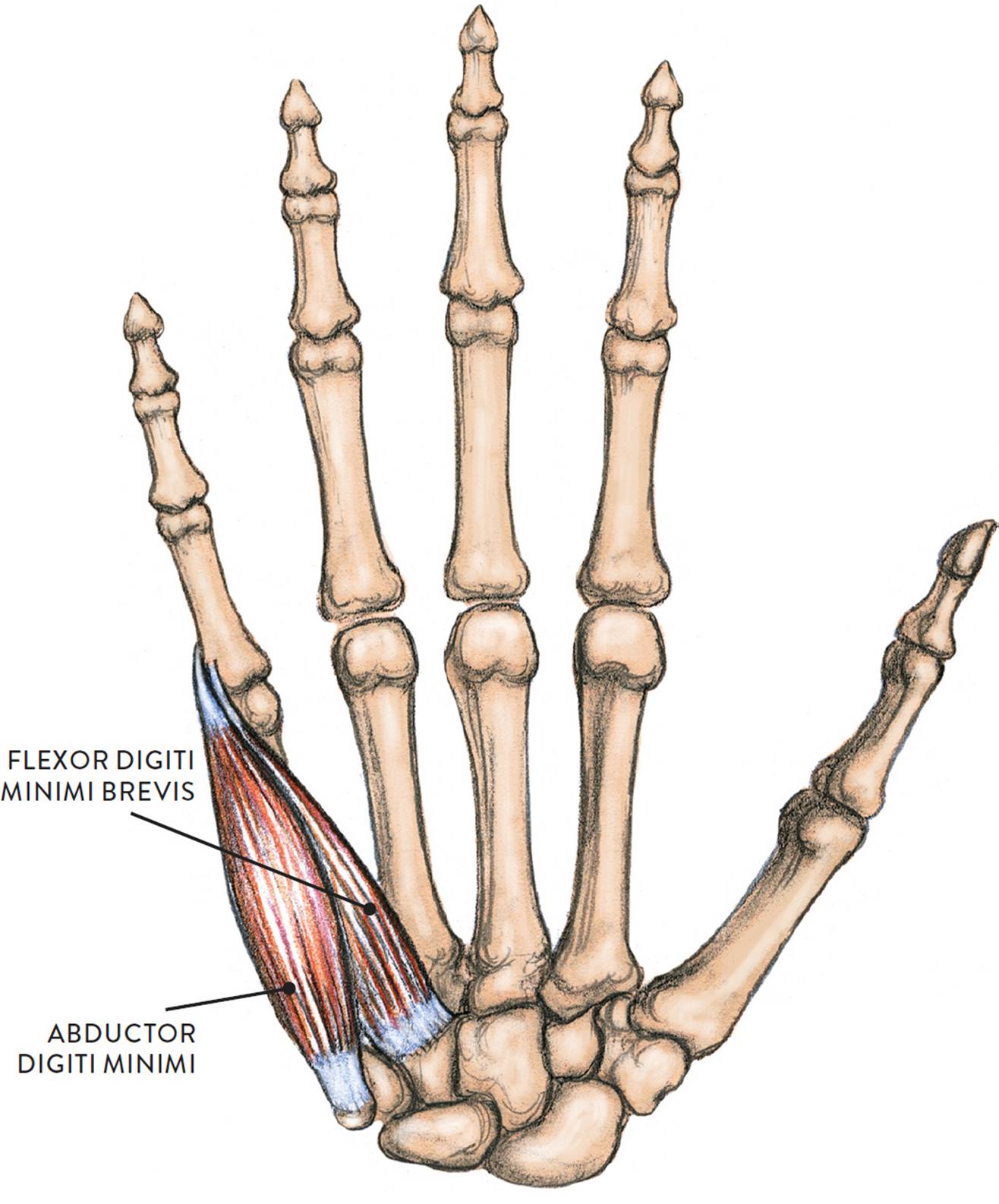 Along the outer edge of the foot, beginning near the fifth toe and terminating in the heel region, is the abductor digiti minimi. This narrow, streamlined muscle is padded with fatty tissue on its lower border and appears as a noticeable ledge along the outer region of the foot. When this muscle contracts, it pulls the little toe sideways from the foot (abduction) and also helps bend the little toe (flexion).