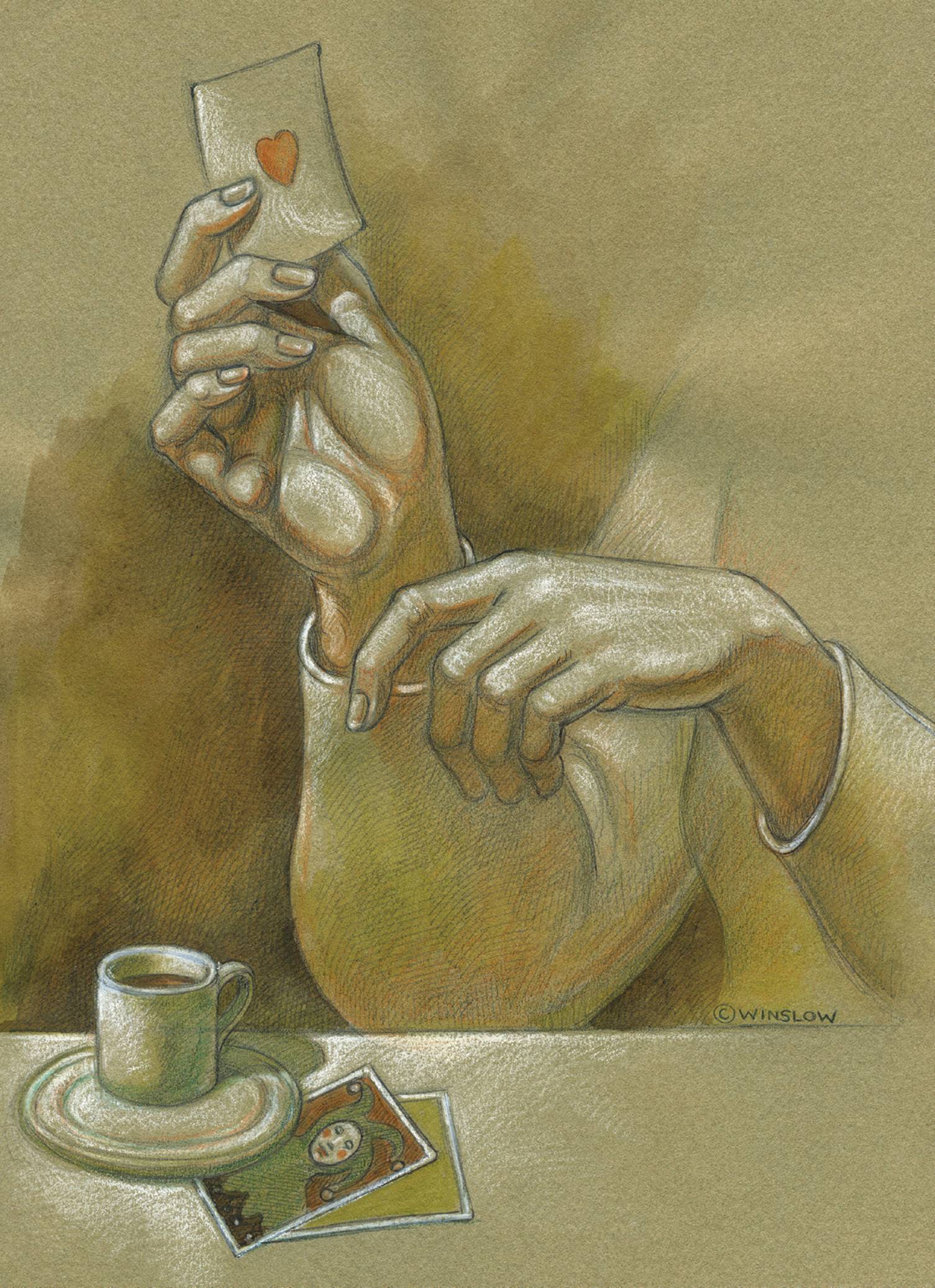 Graphite pencil, ballpoint pen, watercolor pencil, and white chalk on toned paper.