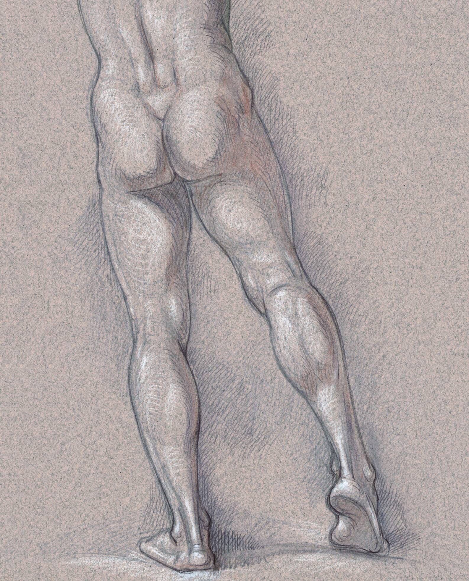 In the following life study Male Figure with Right Leg Positioned on the Ball of the Foot, you can see the rich bulging shape of the gastrocnemius muscle with its tendon (the Achilles tendon) appearing as a thick cord as it inserts into the heel. The accompanying muscle diagram shows the locations of the various surrounding muscles.