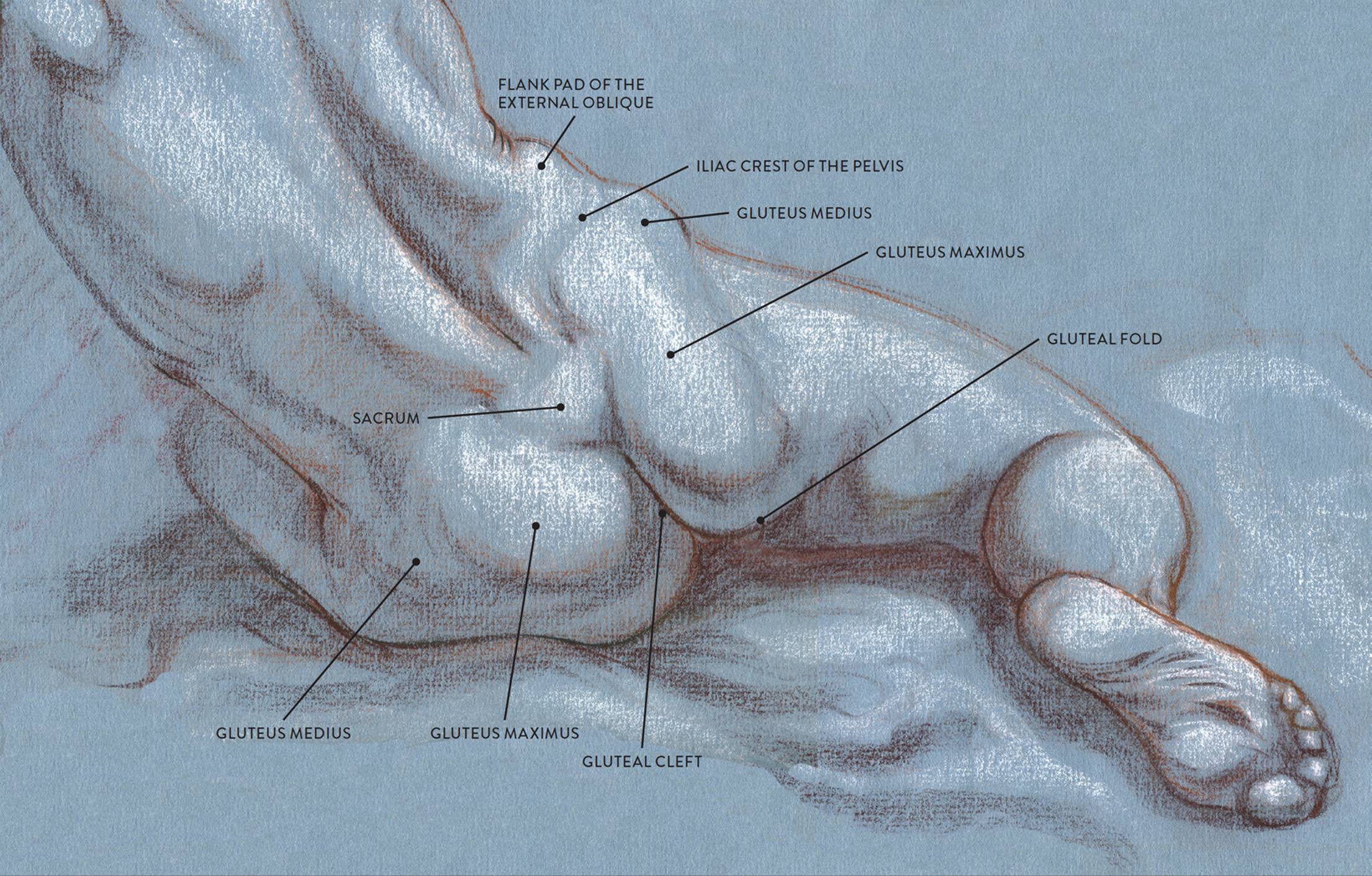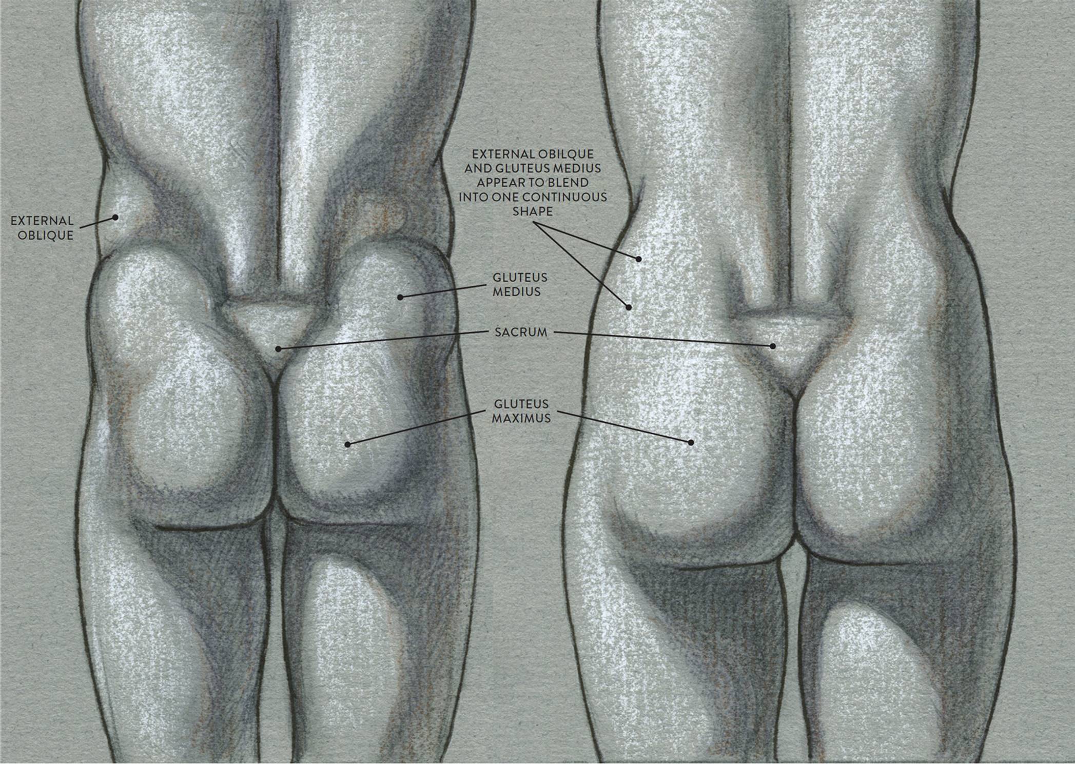 The gluteus medius (pron., GLOO-tee-us MEE-dee-us) is a fan-shaped muscle that occupies the central portion of the pelvis bone. It is positioned between the tensor fasciae latae and gluteus maximus and appears as a prominent muscular bulge, especially when the muscle is contracting. This bulge should not be confused with the bulging form of the flank pad of the external oblique muscle, which is positioned directly above it on the side view of the torso. The iliac crest of the pelvis bone acts as a border between the two forms. If, however, there is substantial fatty tissue in this region, then the gluteus medius and the flank pad of the external oblique will appear as a single soft shape.