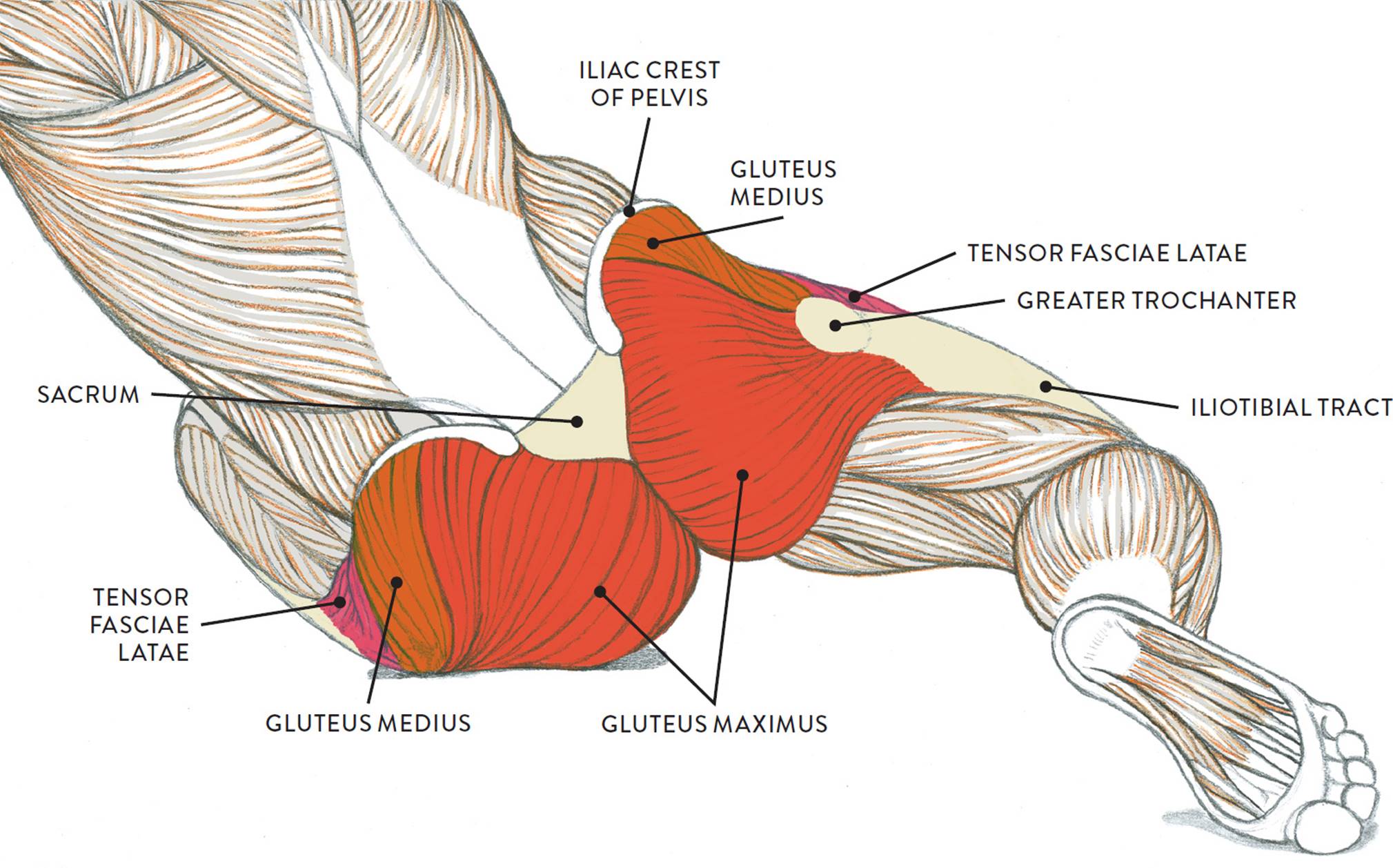 The gluteus maximus begins on the iliac crest of the pelvis and the outer edges of the sacrum and coccyx (tailbone) and inserts into the femur and the upper portion of the iliotibial tract. The iliotibial tract descends vertically down the outer side of the upper leg and eventually inserts into the lateral condyle of the tibia (large bone of lower leg). The gluteus maximus is the dominant extensor of the upper leg (femur). It bends the upper leg back from the hip joint (extension), and rotates the upper leg in an outward direction (lateral rotation).