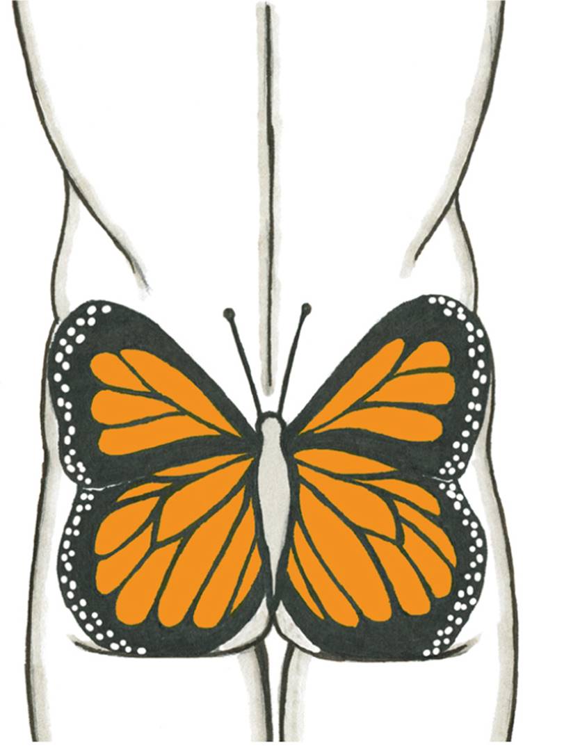 The gluteus minimus (pron., GLOO-tee-us MIN-ah-mus) is positioned on the central portion of the pelvis, beneath the gluteus medius. Even though this muscle is obscured from view by the gluteus medius, its fibers contribute to the bulging shape of the surface form in the side region of the pelvis. The muscle begins on the lower outer portion of the ilium and inserts on the greater trochanter of the femur. The gluteus minimus assists in the action of moving the upper leg away in a sideways direction (abduction) and helps rotate the upper leg inward (medial rotation).