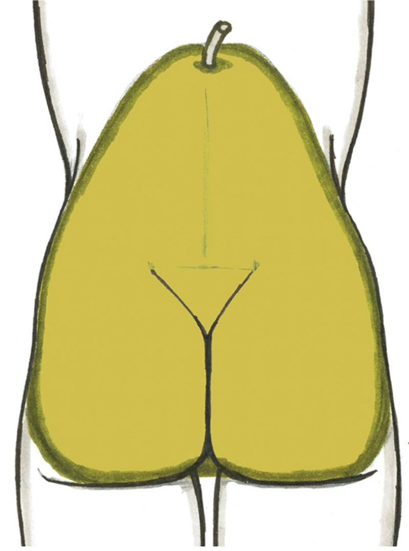 The gluteal muscle group and other soft-tissue forms of the female pelvis region are shaped like a pear.