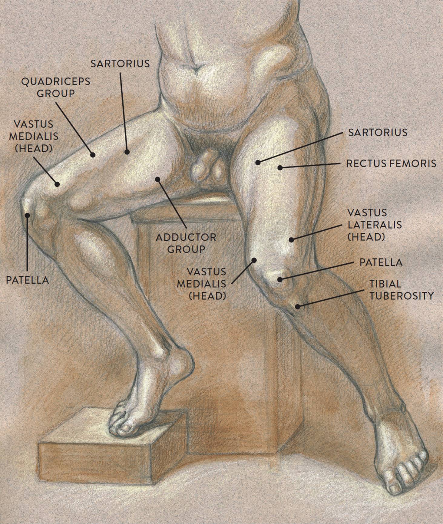 Each muscle of this group starts at four different locations on the femur and pelvis, and the muscles merge into one common tendon (tendon of quadriceps) that inserts into the patella (kneecap). The tendon continues past the patella to attach into the tibial tuberosity of the tibia; this latter segment of the tendon is usually called the patellar ligament. When depicting the knee region, it is essential for artists to locate the patella because it is the main anchoring site for the quadriceps muscle group.