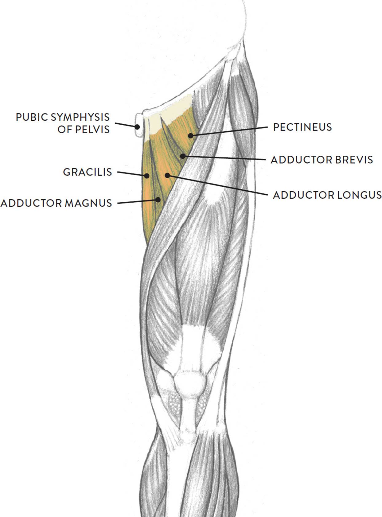The individual muscles of the adductor group begin at various locations on the lower pelvis, including the ischium bone, the pubic bone, and the vicinity of the pubic symphysis. They insert along the whole back of the femur, while the gracilis muscle moves past the knee joint to attach into the tibia. As their name indicates, they mainly perform the action of moving an outstretched leg positioned sideways from the torso back to a normal standing position (adduction). Most of these muscles also help in bending the upper leg at the hip joint (flexion).