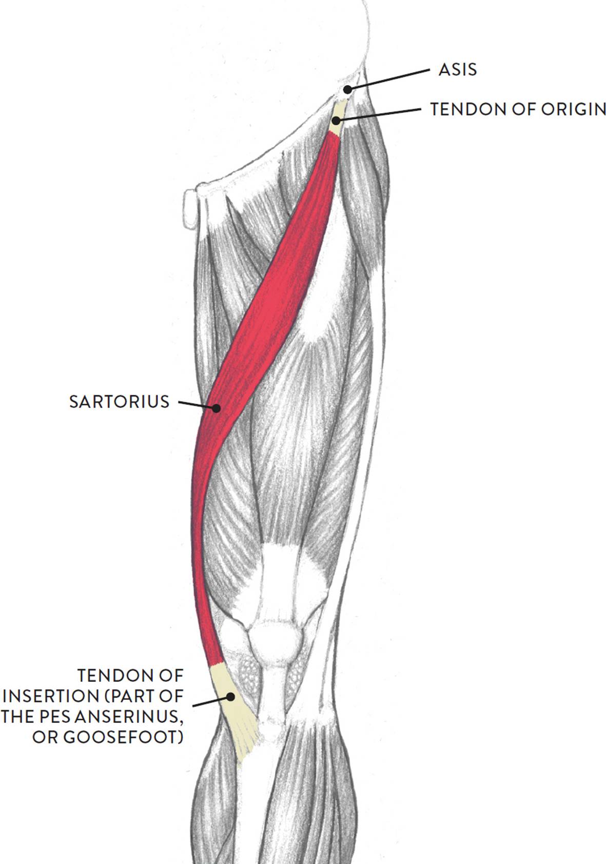 The sartorius begins at the ASIS of the pelvis; its lower portion wraps snuggly around the inner condyles of both the femur and tibia and inserts into the medial condyle of the tibia. The tendon of the sartorius, along with other tendons, forms what is called the pes anserinus, meaning “goosefoot” because of its webbed appearance, resembling the foot of a goose. The serpentine rhythm of the sartorius, as it sweeps obliquely downward across the upper leg, is continued on the lower leg by the tibia, or shinbone, and this serpentine movement of both muscle and bone has been utilized by many figurative classical artists, past and present.
