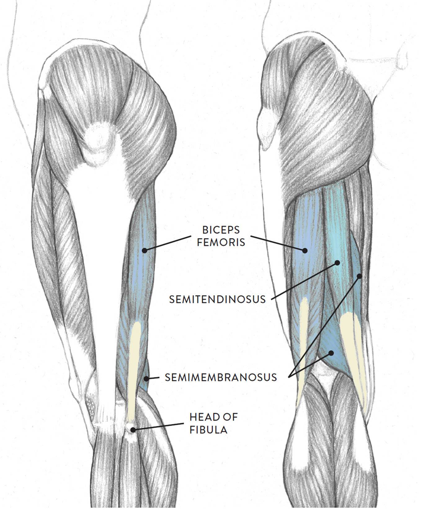 The hamstring muscle group, shown in the next drawing, consists of three muscles—the biceps femoris, semitendinosus, and semimembranosus—that occupy most of the posterior region of the upper leg. Usually, the hamstring group appears on the surface as a cylindrical shape, with little evidence of the individual muscles. Only on athletic legs can you see a slight furrow between the biceps femoris and the semitendinosus. The tendons of the hamstring muscles, however, do appear as “tongs” grasping the upper portions of the gastrocnemius (calf) muscle. Between the tendons is a space called the popliteal fossa, with a small fat pad. The hamstring muscles are flexors, moving the upper leg (femur) at the hip joint and the lower leg (tibia and fibula) at the knee joint.
