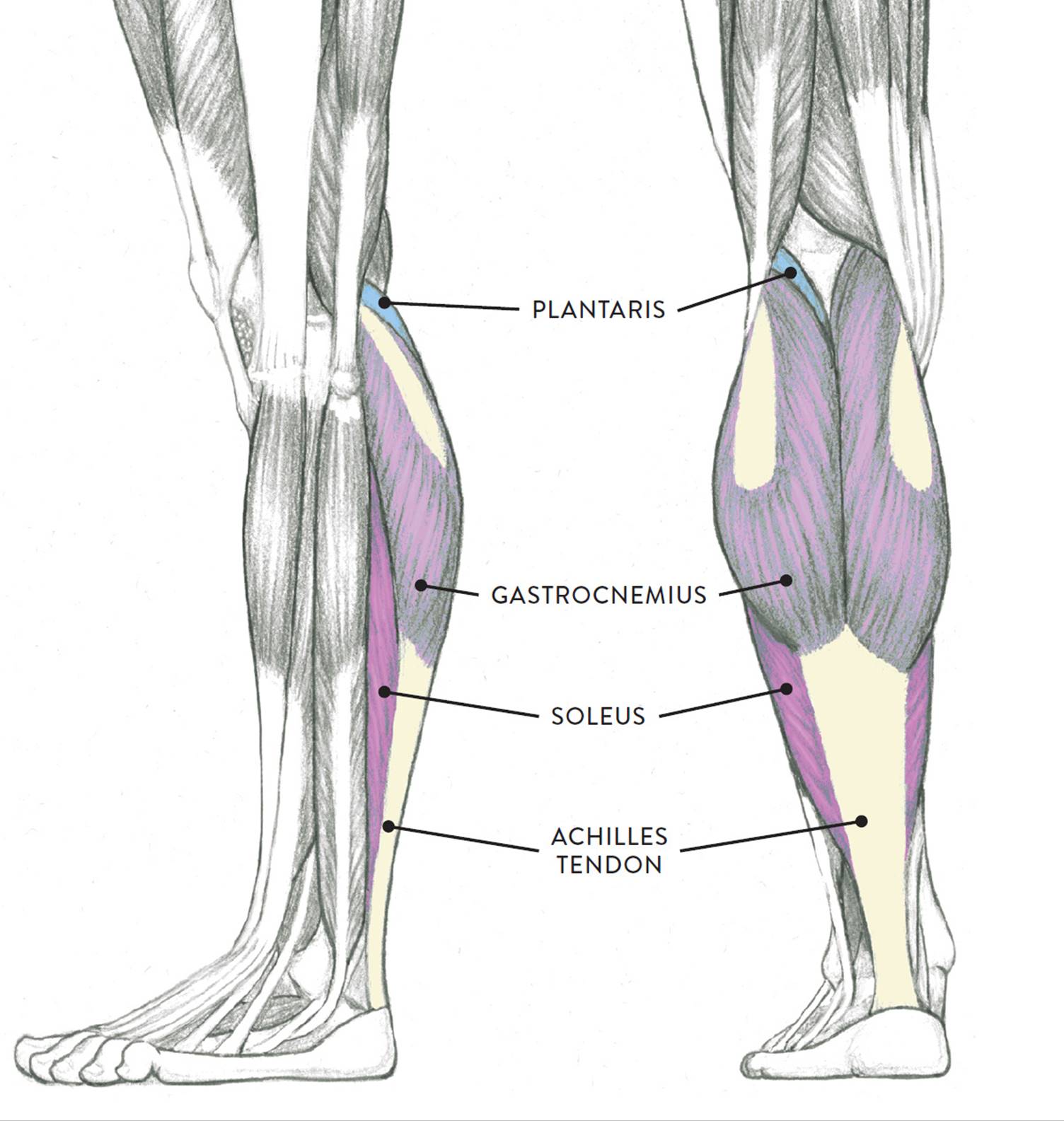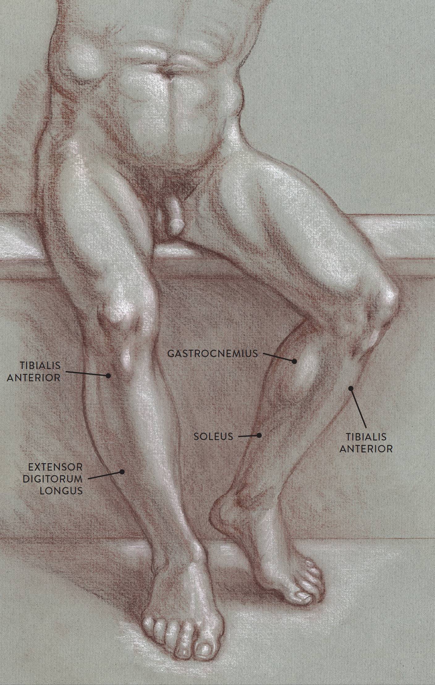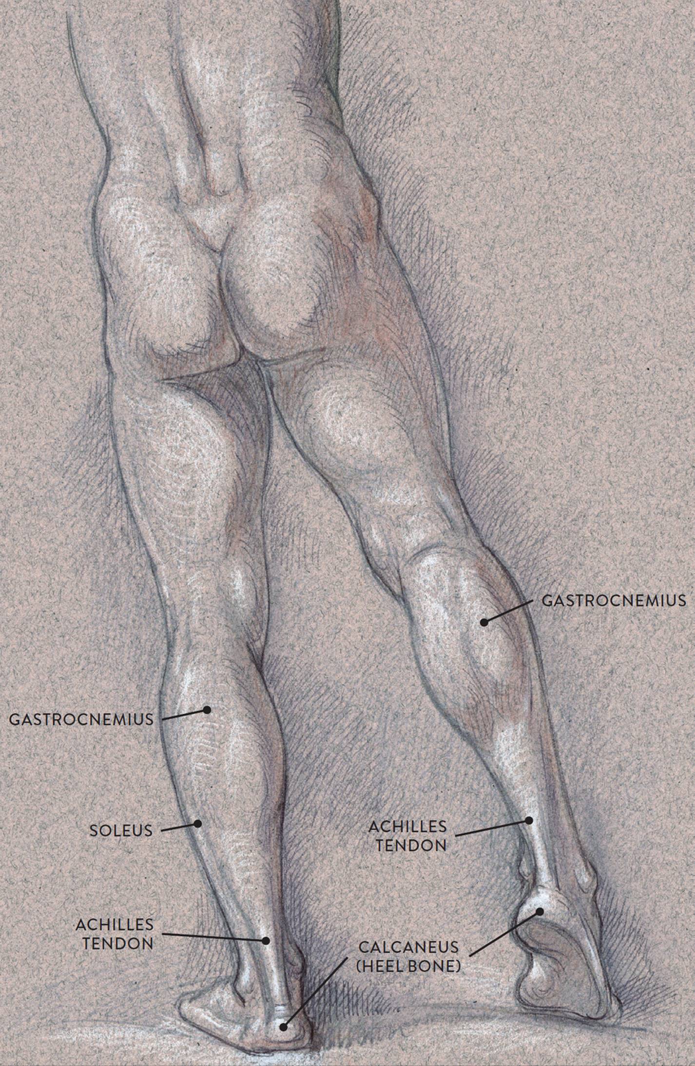 The gastrocnemius (pron., gas-trock-NEE-mee-us), more commonly known as the calf muscle, is an impressive oval muscular shape occupying the upper half of the lower leg in the posterior region. The two heads of the gastrocnemius begin on the large condyles of the femur—the lateral head on the lateral condyle and the medial head on the medial condyle. The muscle fibers merge into a common tendon, which inserts into the calcaneus of the foot (heel bone). Its tendon appears as a neutral area until it converges into the thick cordlike form known as the Achilles tendon. The tendon serves as an important landmark for artists as it flows downward from the rich shape of the calf to eventually anchor into the heel bone. The gastrocnemius helps bend the lower leg at the knee joint (flexion of the lower leg). When it contracts it also helps raise the heel, which is seen in the action of pointing the foot (plantar flexion) and in the tiptoe position.