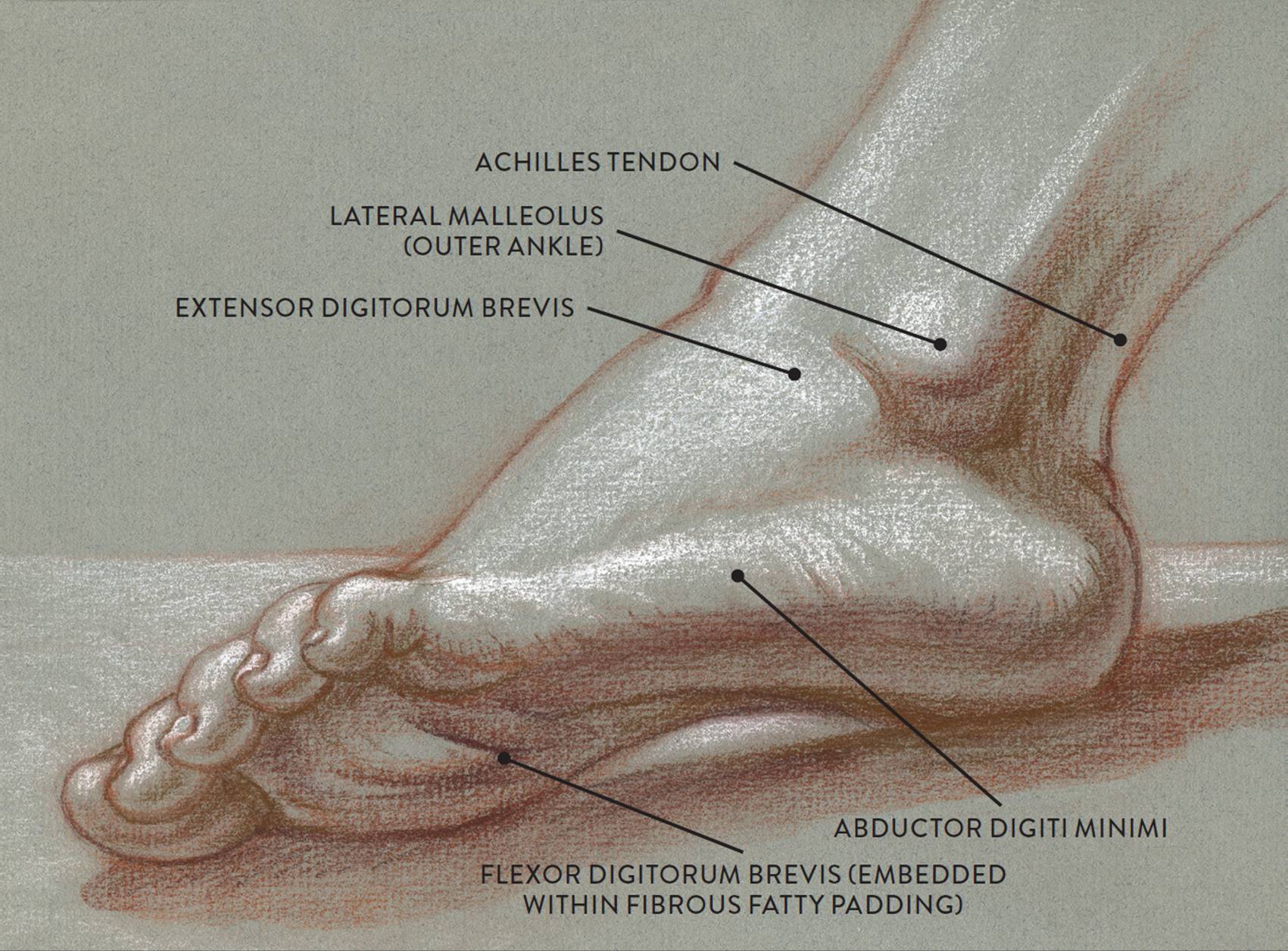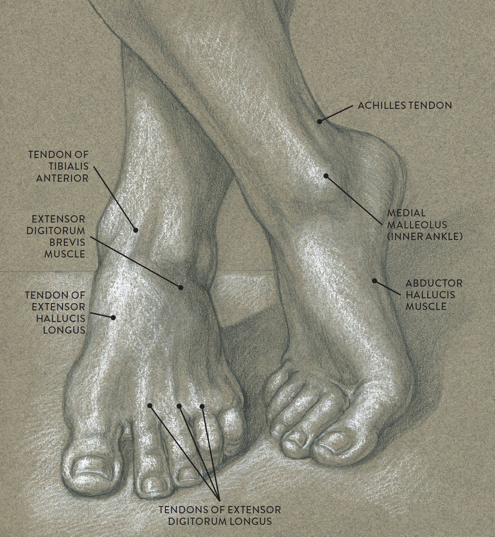 As with the hands, I recommend practicing drawing the feet in many different positions. Sketching the feet from various sources (master artists’ paintings and sculpture, models’ feet, photos) will help you gain confidence and skill when approaching these difficult forms. The studies can be gesture drawings (see this page) that quickly capture the general shape of the foot or longer studies, such as the ones to the right, that emphasize the anatomical forms of the foot.