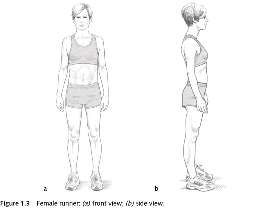 Women have been latecomers to the running scene. Races for women longer than 400 meters were not introduced to the Olympic Games until 1964 because it was considered, without any scientific proof, that they might suffer some unspoken medical ailment if they were to “strain” themselves. Once it was shown that they thrived in competition, their advancement was so rapid that by 1984 they were allowed their very own marathon at the Los Angeles Olympics. Anatomically, women are generally disadvantaged compared to their male counterparts (compare figures 1.2 and 1.3), especially where the long, light levers that make up the lower limbs are concerned, but physiologically they are in some ways better prepared, especially for ultradistance running. Because they have proportionately more fat as a percentage of body weight compared to their male counterparts, they have greater reserves of energy and stored fluid to call on, although it may take days rather than hours of competition for this to emerge. It is in ultradistance racing that the performance of women comes closest to men. With increasing distance, the difference between the sexes in statistical terms in time run becomes less and less marked, so it may well be that one day a woman will win an open race purely as a result of better physiological efficiency. Women are disadvantaged by relatively short thighs, which become exaggerated by their wider hips and bring the pelvis closer to the ground, resulting in a reduction of stride length. Stride length is perhaps the factor with the most effect on the speed of running. Although the fastest runners take no more than double the number of strides of the slowest over a given unit of time, their stride length may be up to four times greater.