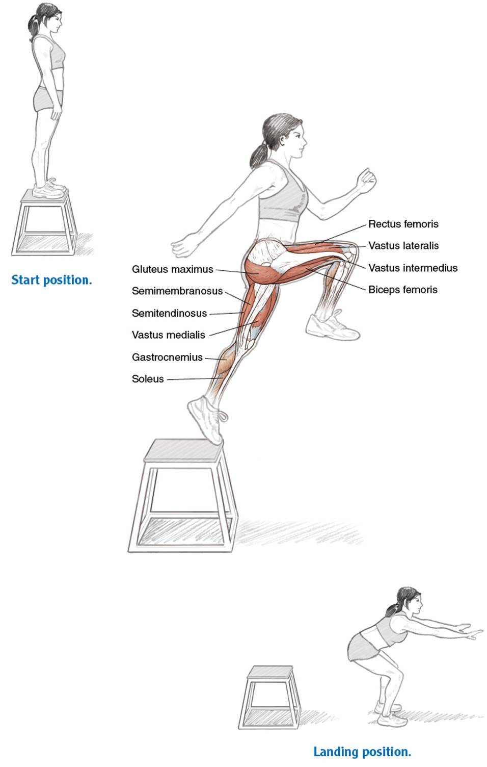 Following are four beginning plyometric exercises that can be incorporated into a running program. The exercises do not all meet the true definition of a plyometric exercise (eccentric muscle contraction, inertia, concentric contraction), but because they do involve explosive muscle-contraction movements, most current training programs include them as plyometric drills. These can be performed all in one session, as one set only, as multiple (two or three) sets of each for a heavier day, or as just one or two exercises with a single set for an easy preworkout. Limit the total number of repetitions or touches to no more than eight per exercise (except for box steps, which can be done in one-minute intervals at varying speeds) and the total number of sets to no more than five per exercise.