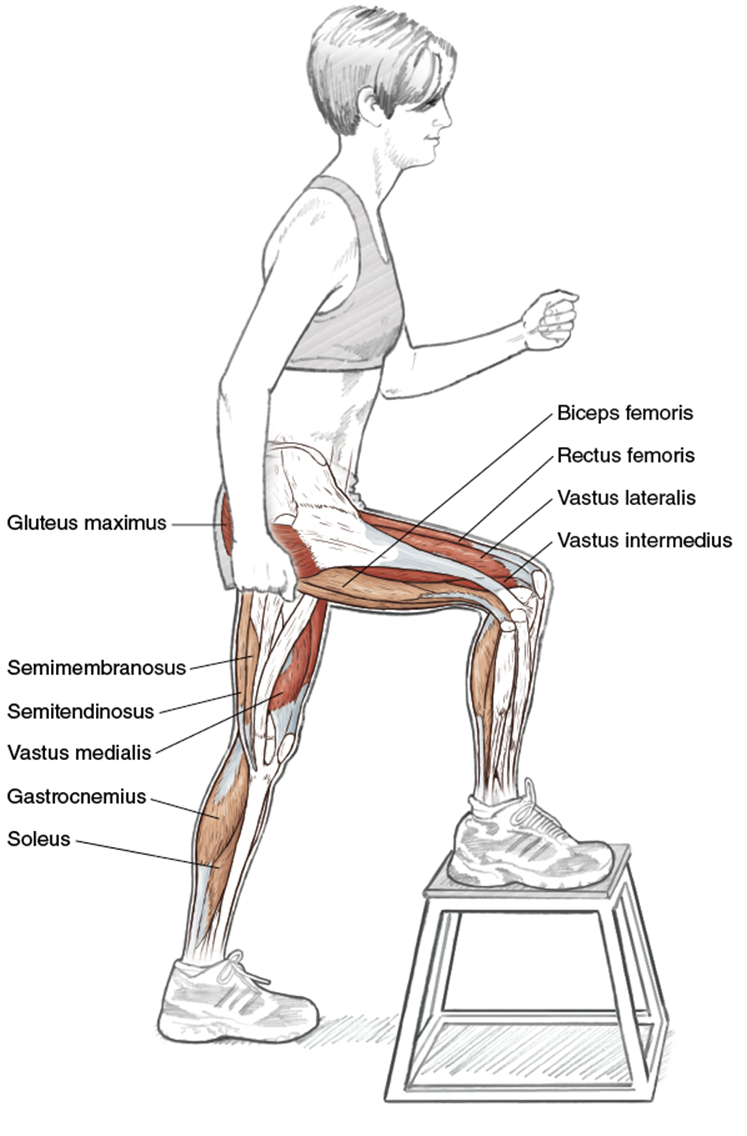Primary: quadriceps, gluteus maximus, gastrocnemius, soleus
