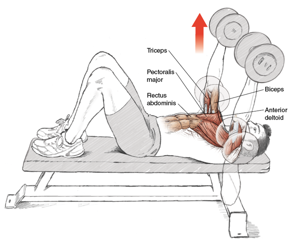 1. Lie supine (back down) on a bench with legs steepled and feet on the bench. There should be a small, natural bend in the lower back so it does not touch the bench. A dumbbell should be held in each hand, at chest level.
