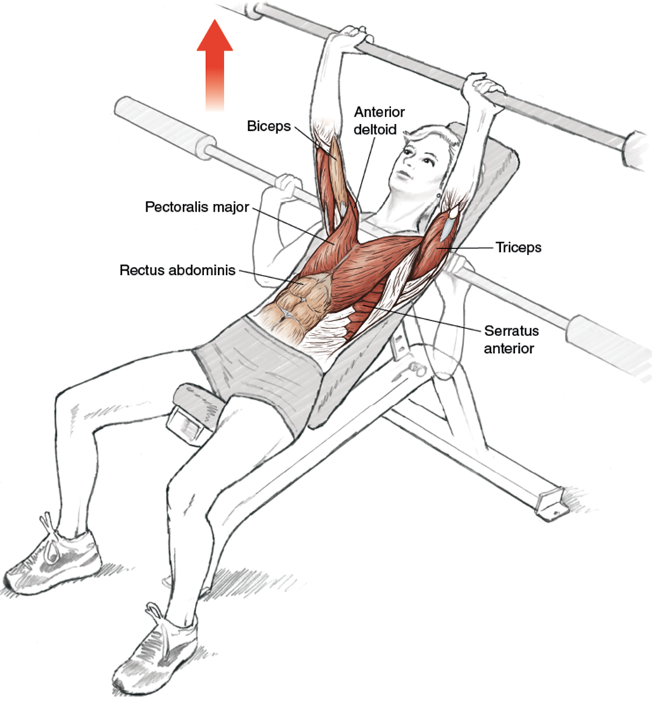 Use of a spotter is highly recommended to help with removing and placing the barbell back on the stays of the bench. Because of the inclined nature of this exercise, there is more shoulder involvement—specifically, the rotator cuff. If any pain is felt in the shoulder, discontinue the exercise and perform only the flat dumbbell press.